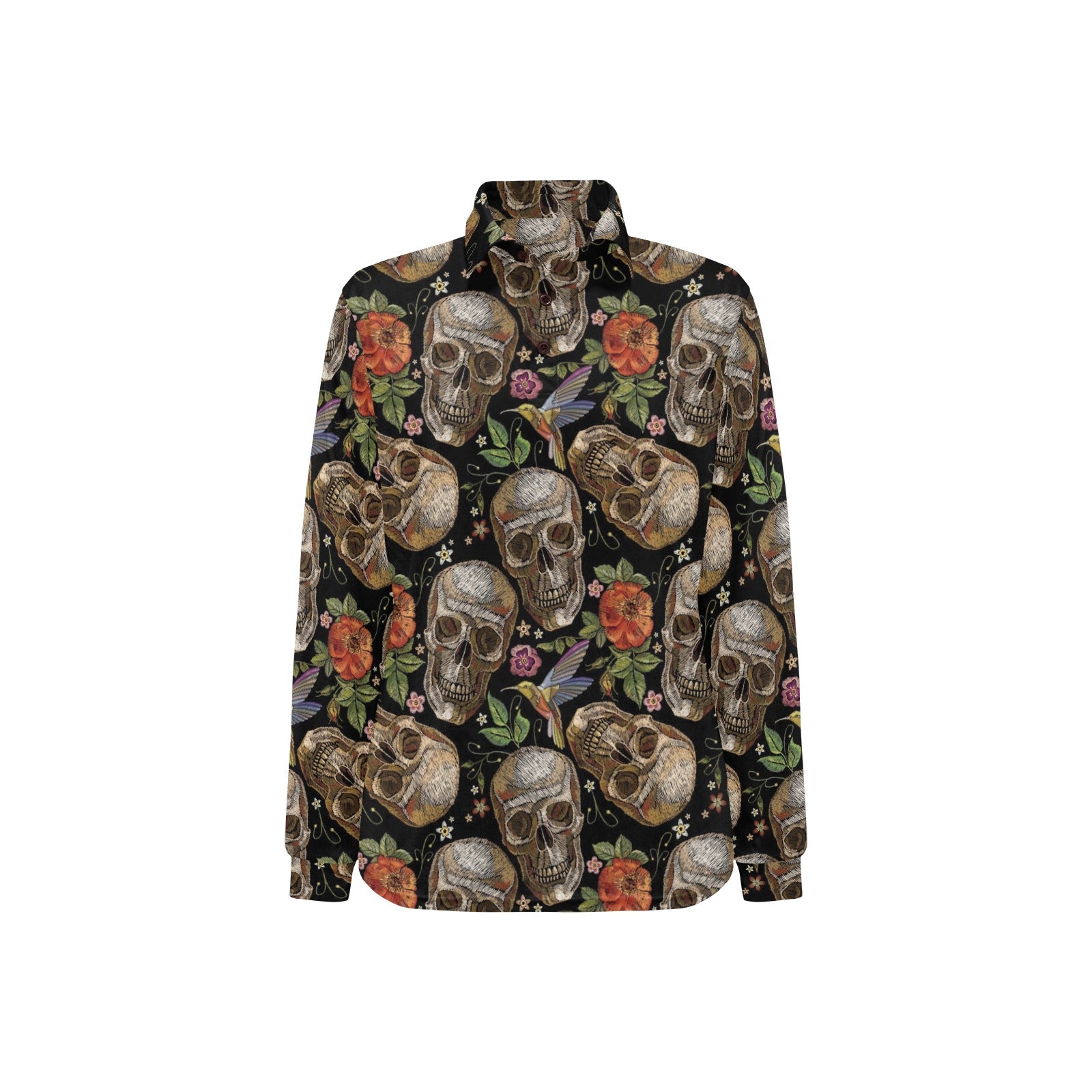 Skull rose humming bird flower pattern Women's Long Sleeve Polo Shirt
