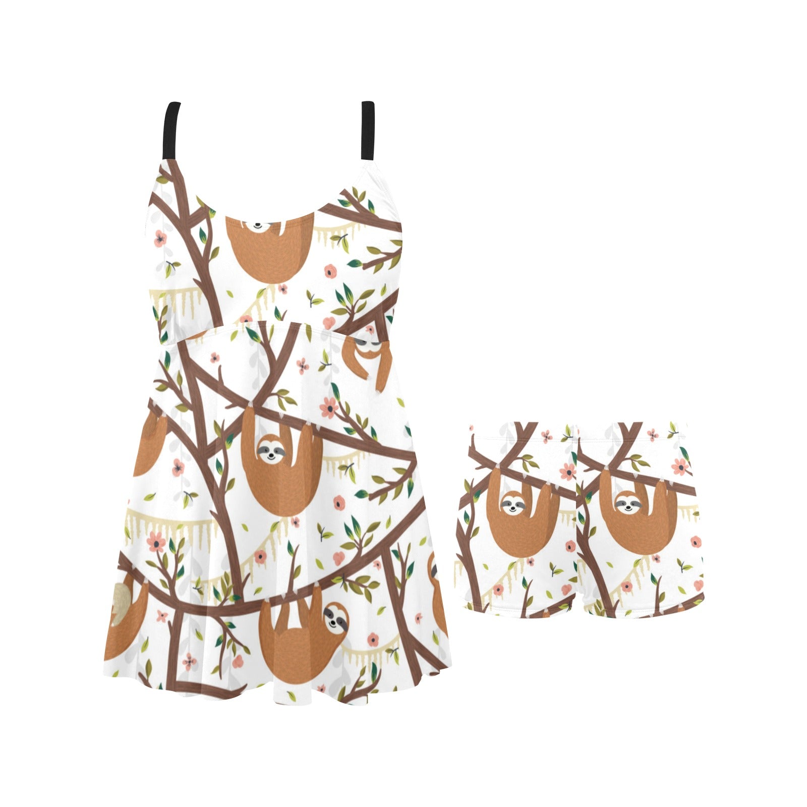 Sloths hanging on the tree pattern Chest Sexy Pleated Two Piece Swim Dress
