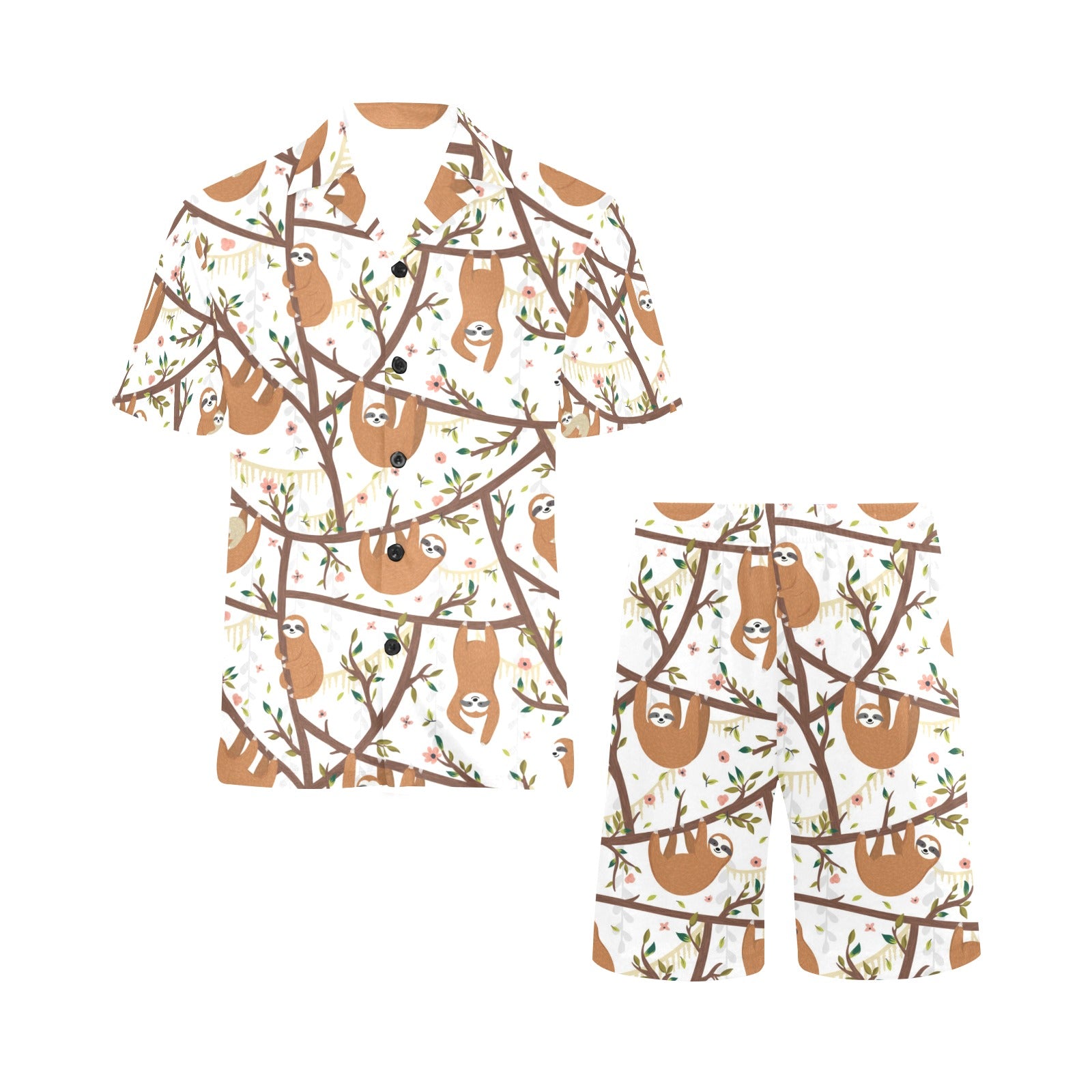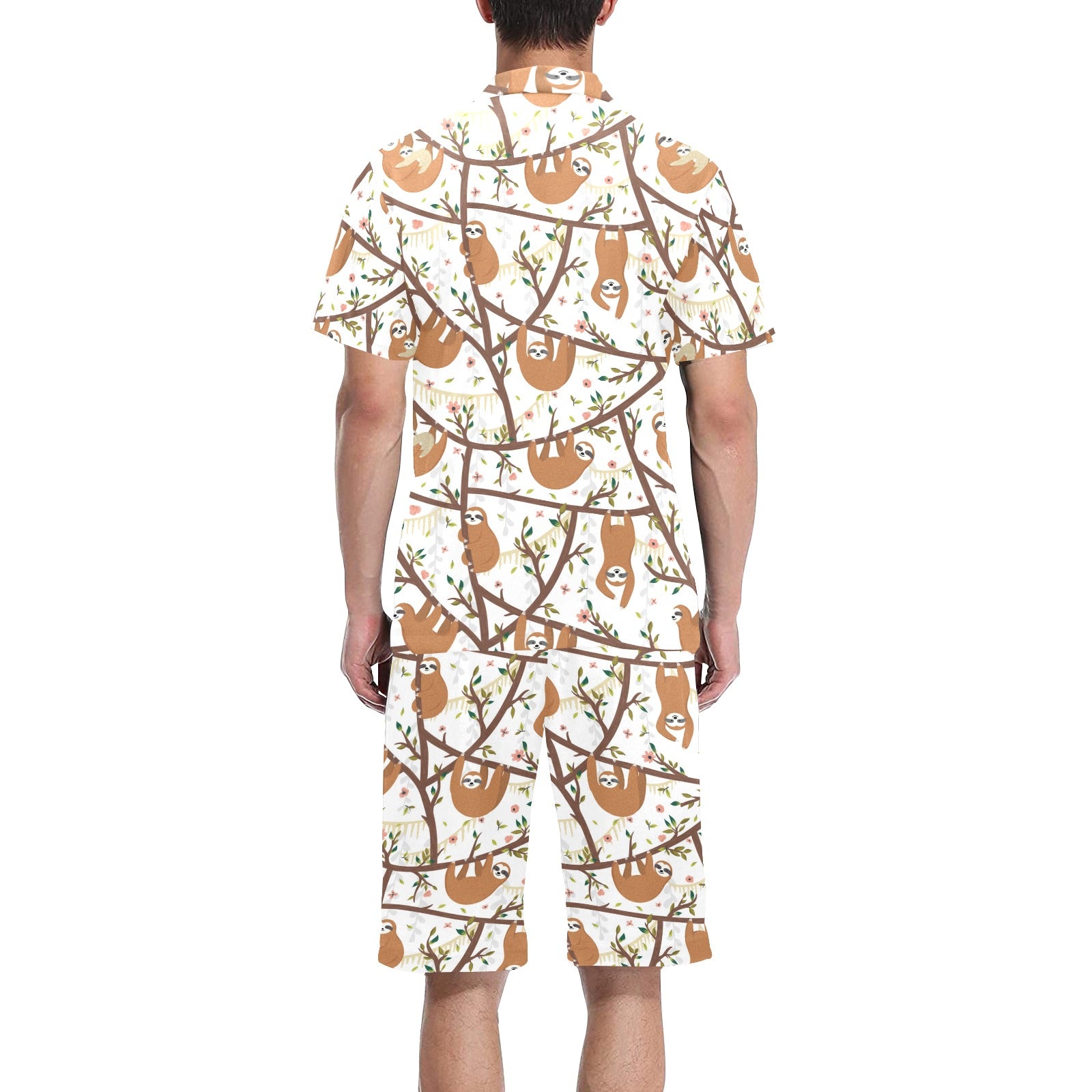 Sloths hanging on the tree pattern Men's V-Neck Short Pajama Set