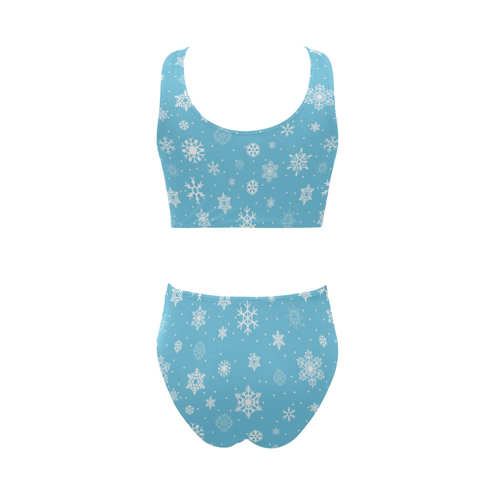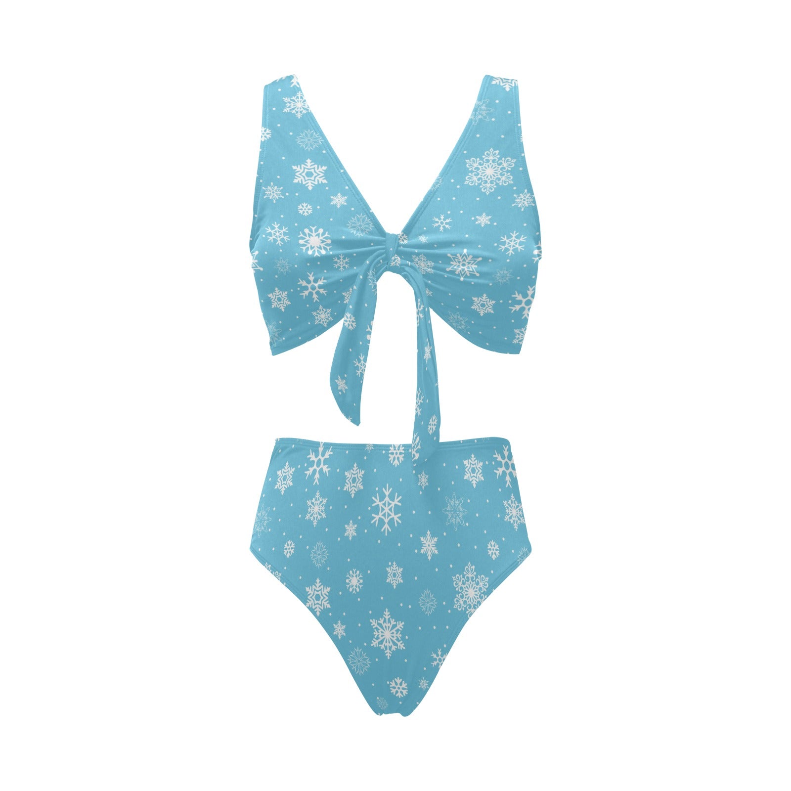 Snowflake pattern blue background Chest Bowknot High Waisted Bikini Swimsuit