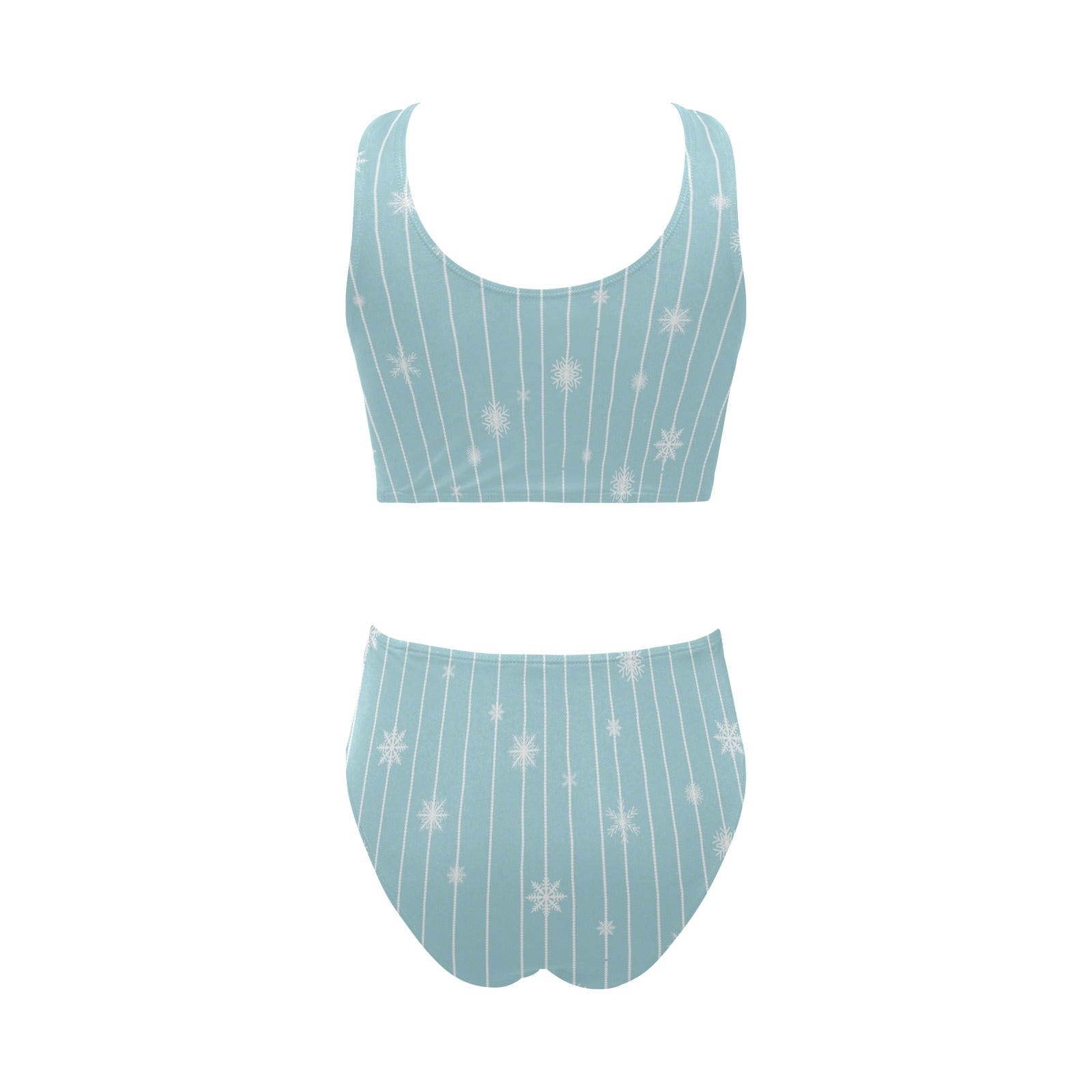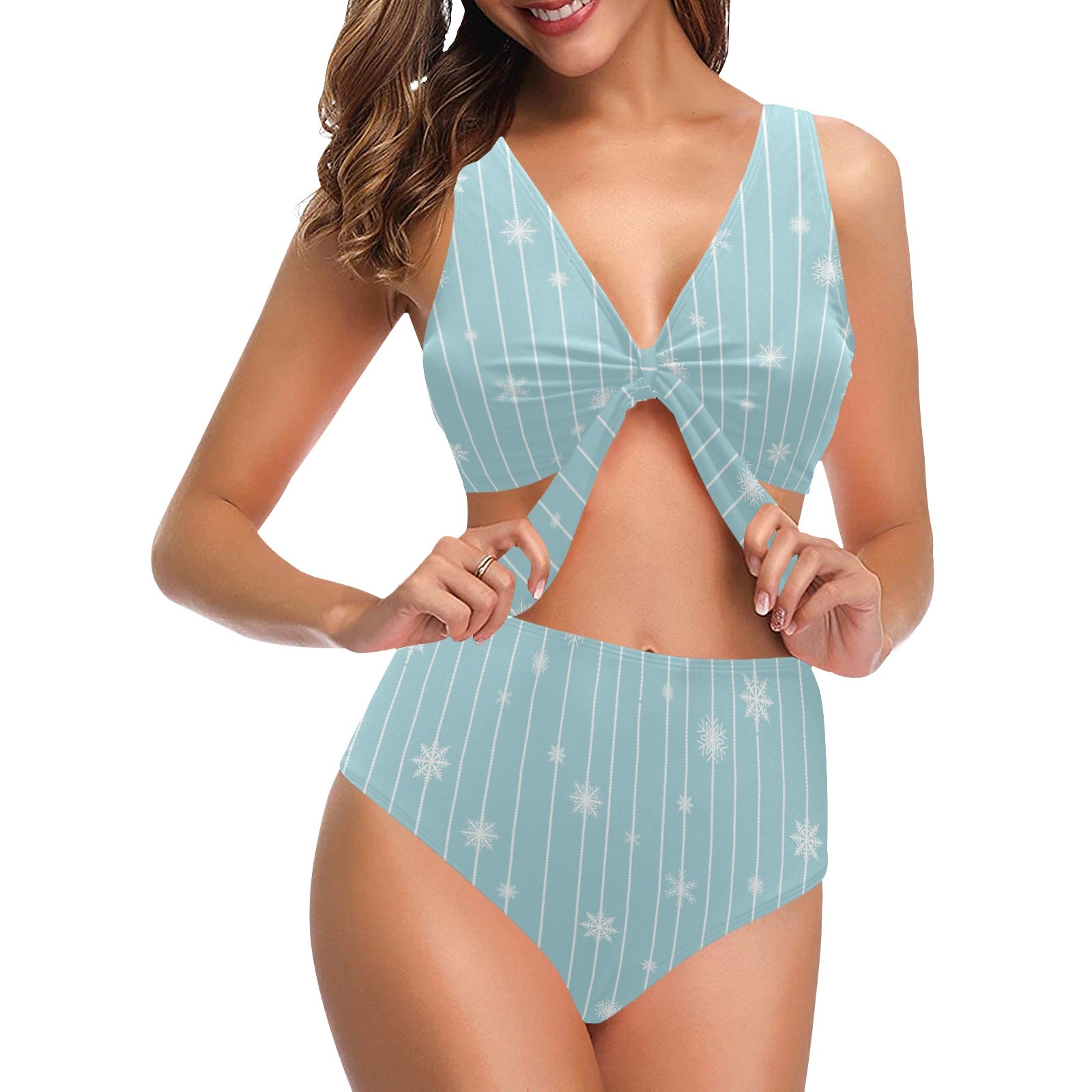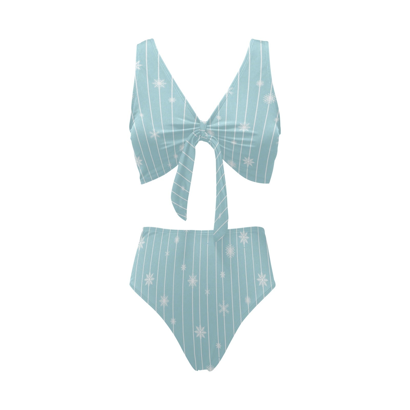 Snowflake pattern blue stripe background Chest Bowknot High Waisted Bikini Swimsuit