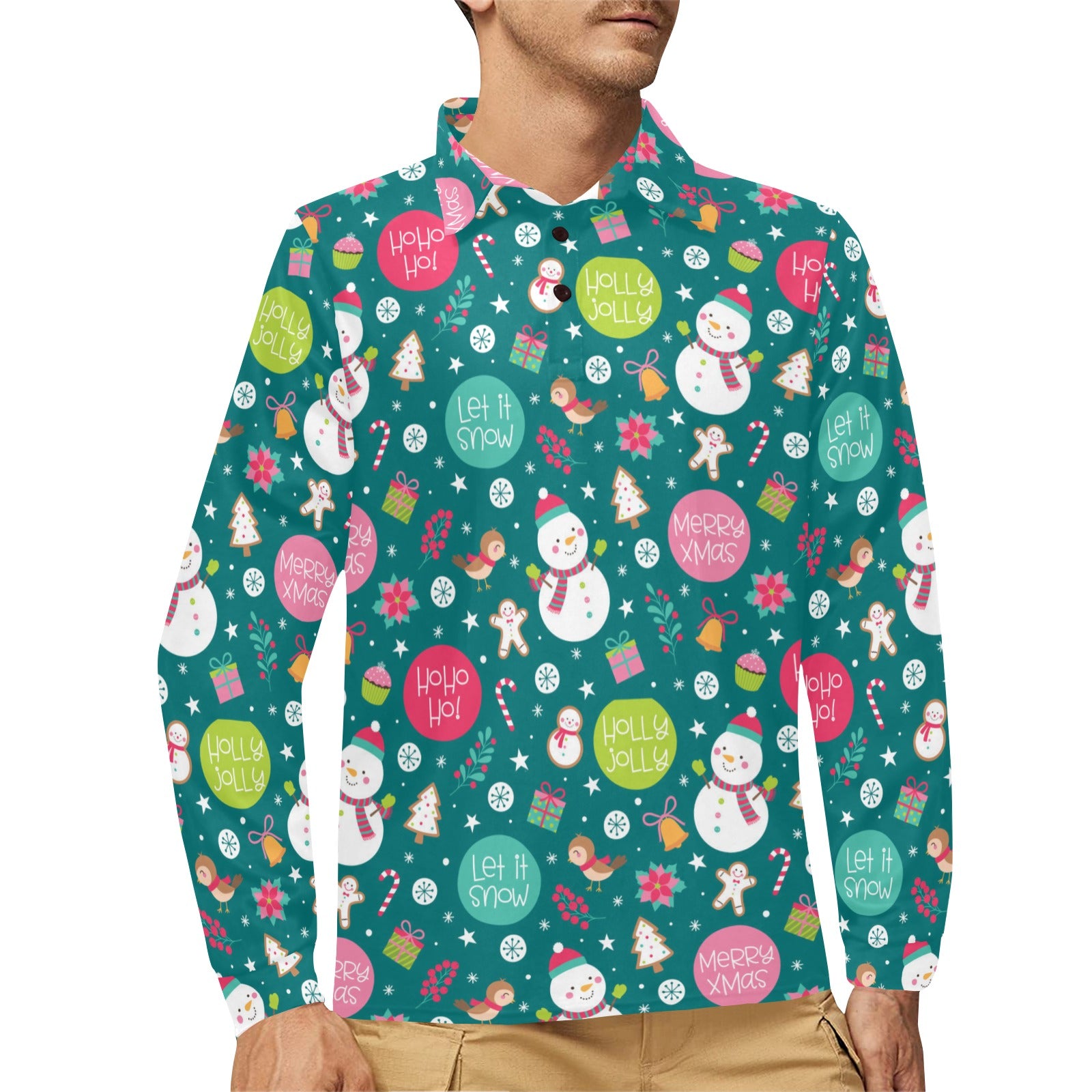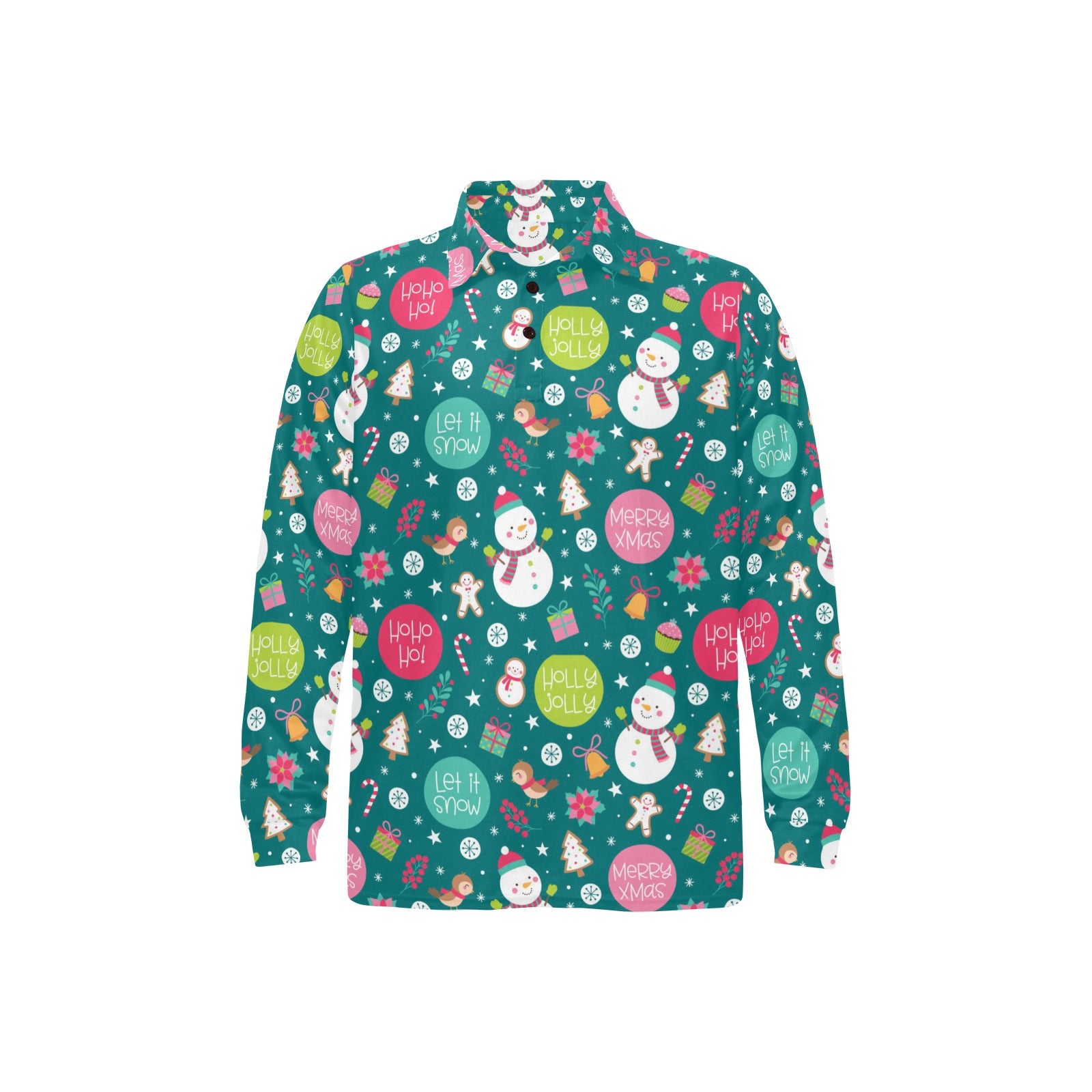 Snowman bird decorative elements christmas pattern Men's Long Sleeve Polo Shirt