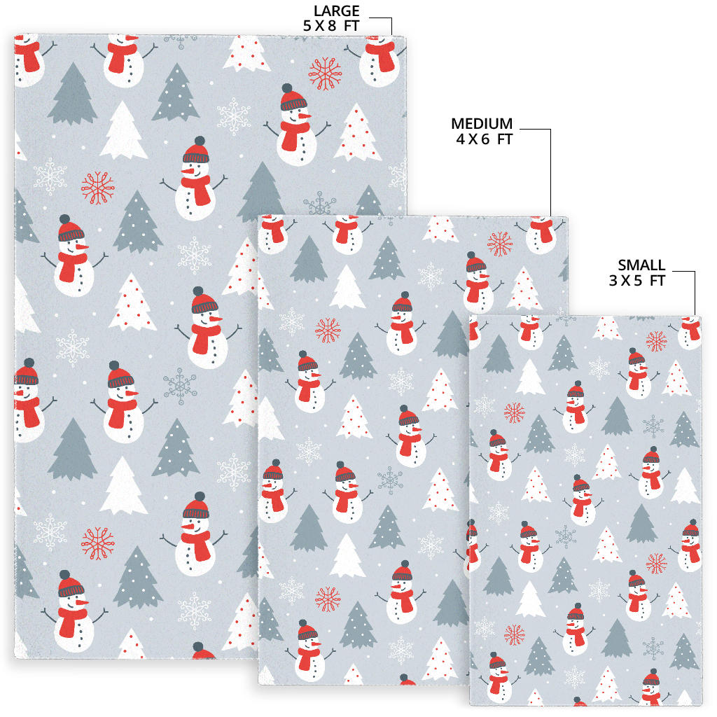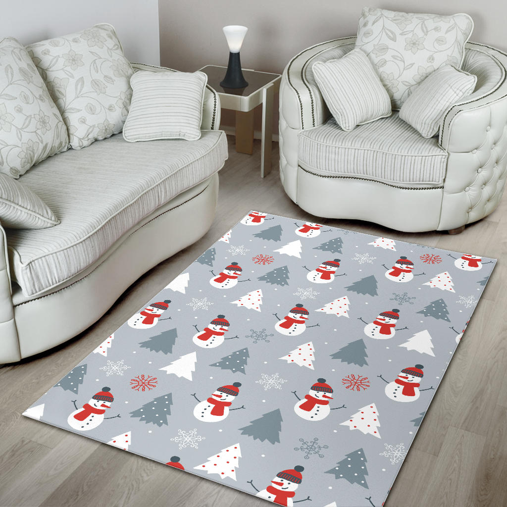 Snowman christmas tree snow gray background Area Rug is a uniqued design and limited item. It made to order, hand printed, and sewn with love in our factory.