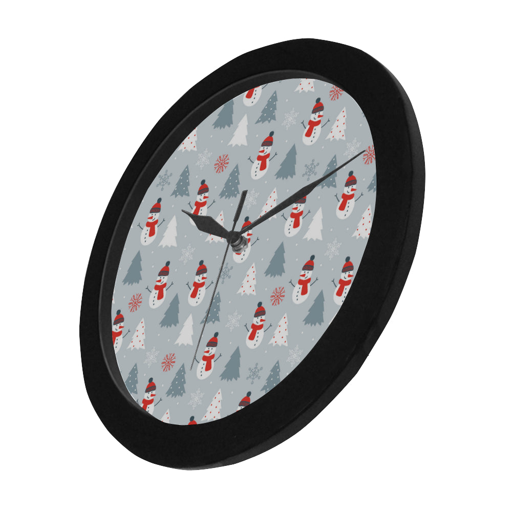 Snowman christmas tree snow gray background Elegant Black Wall Clock is a uniqued design and limited item. It made to order, hand printed, and sewn with love in our factory.