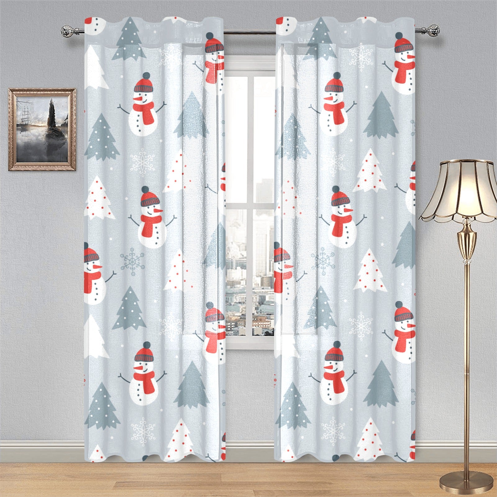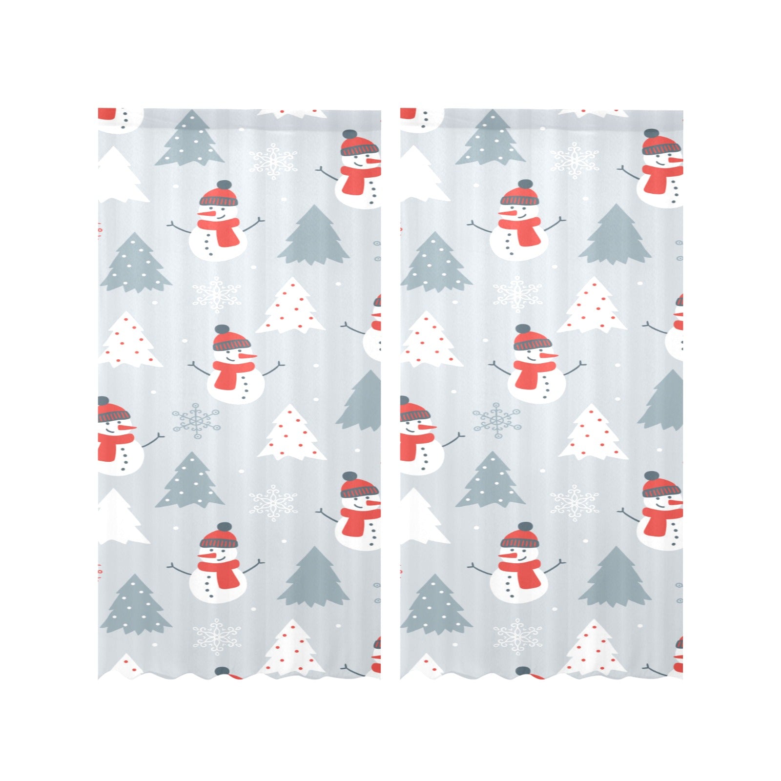 Snowman christmas tree snow gray background Gauze Curtain