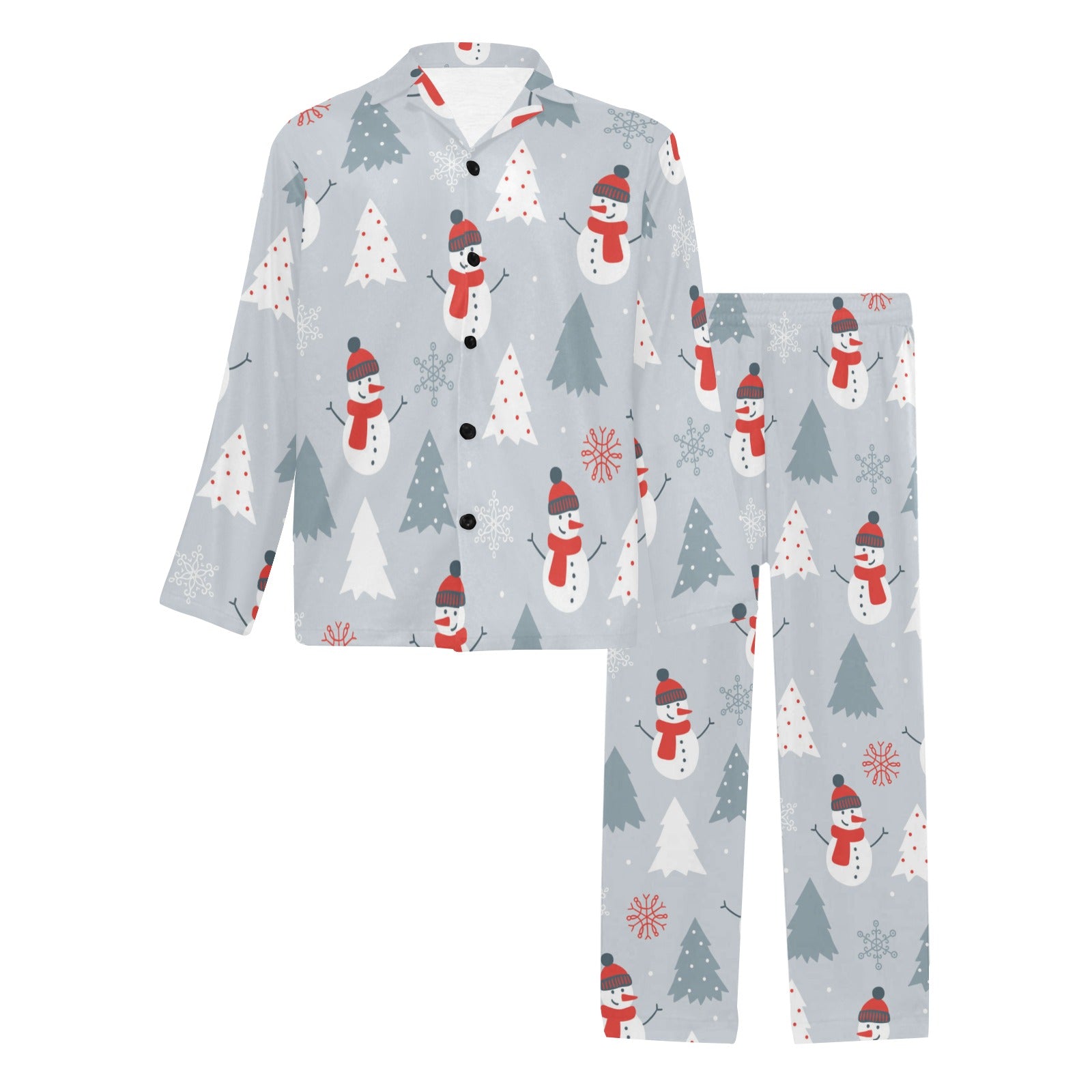 Snowman christmas tree snow gray background Men's Long Pajama Set