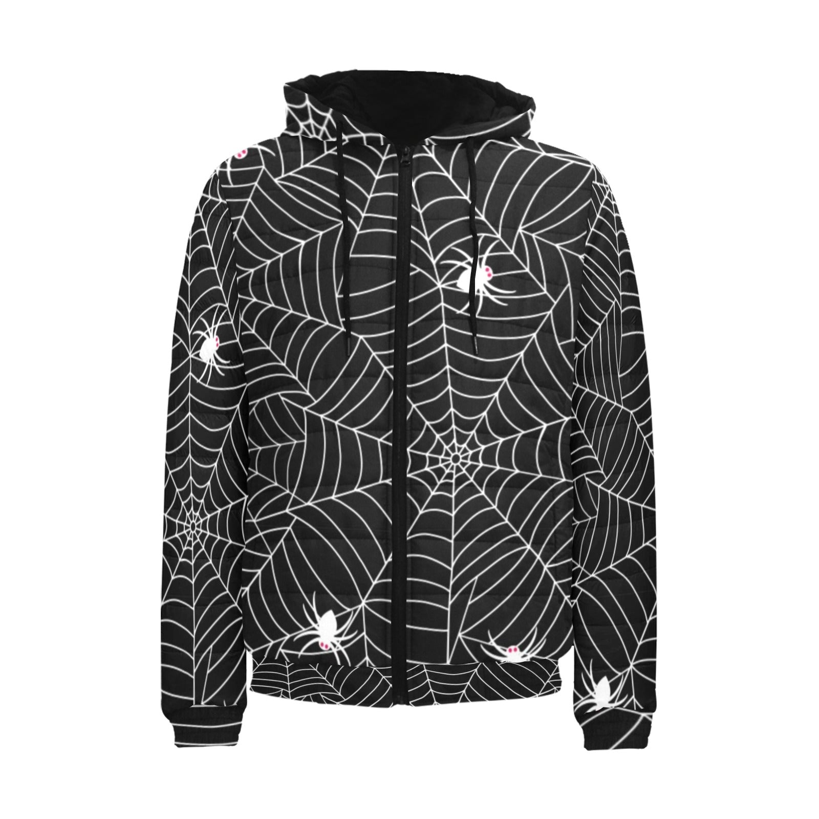 Spider web design pattern Black background white c Men's Padded Hooded Jacket