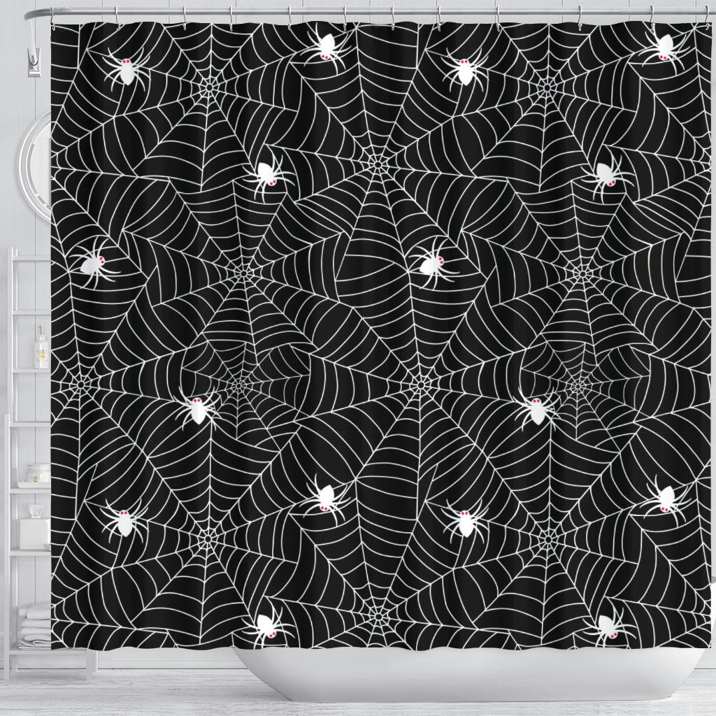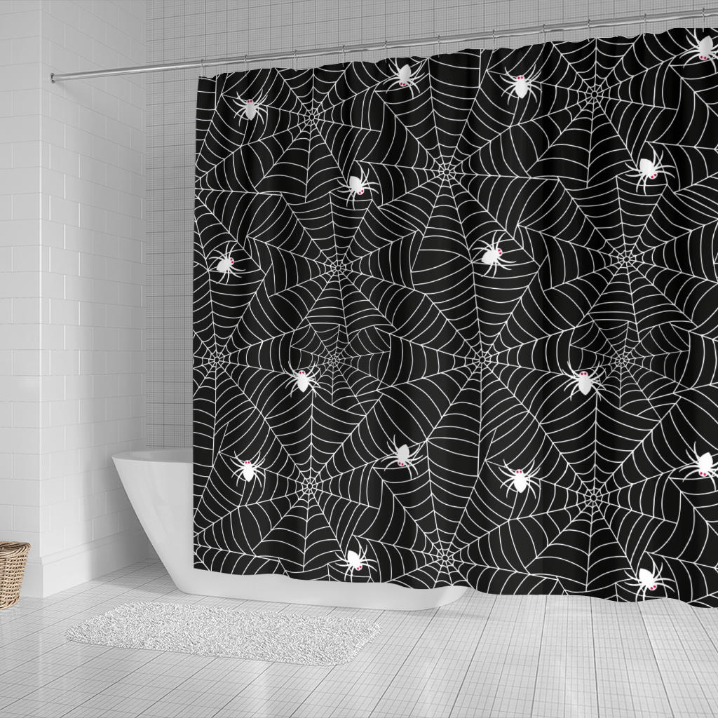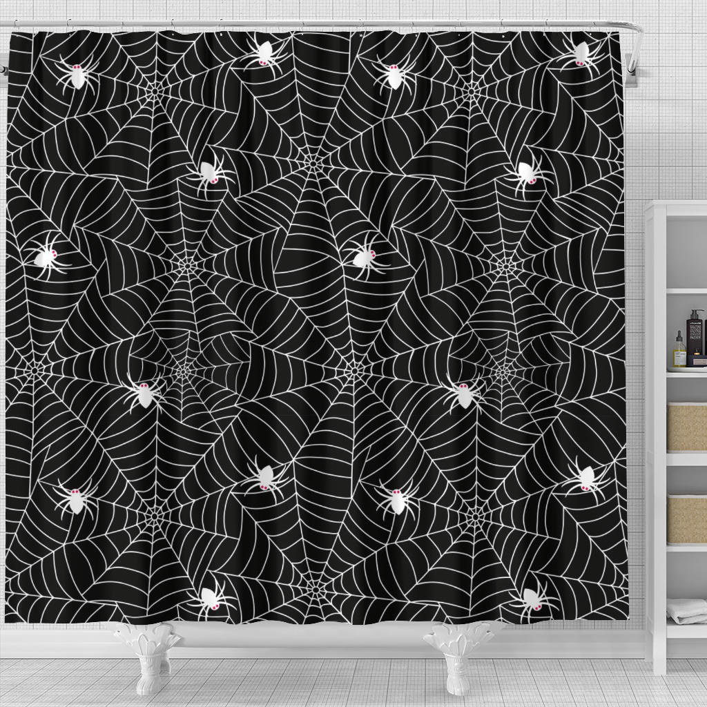 Spider Web Design Pattern Black Background White Cobweb Shower Curtain Fulfilled In US