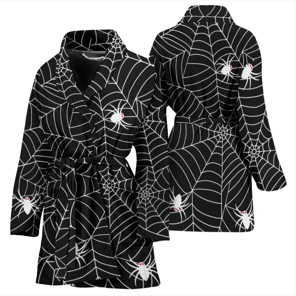 Spider Web Design Pattern Black Background White Cobweb Women'S Bathrobe