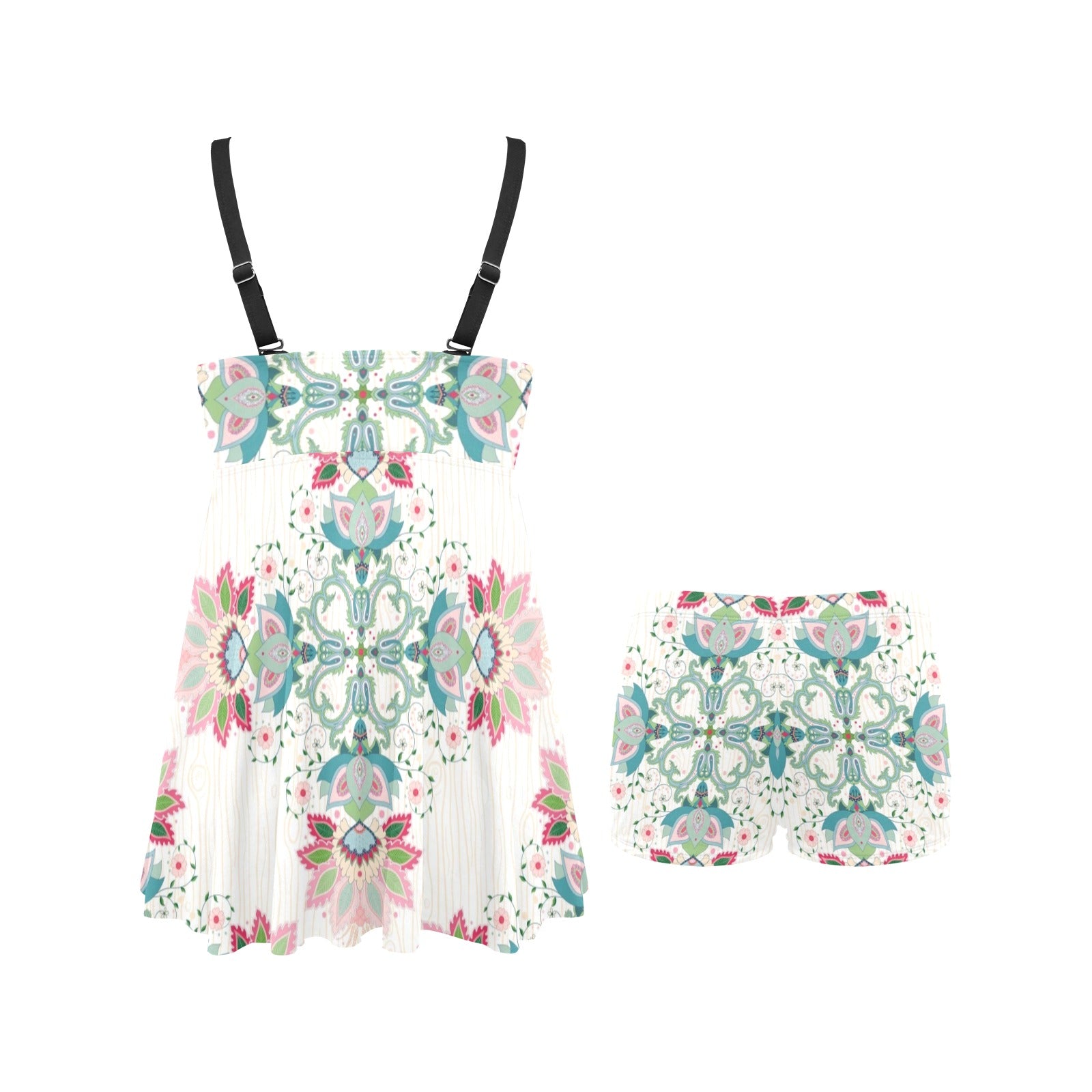 Square floral indian flower pattern Chest Sexy Pleated Two Piece Swim Dress