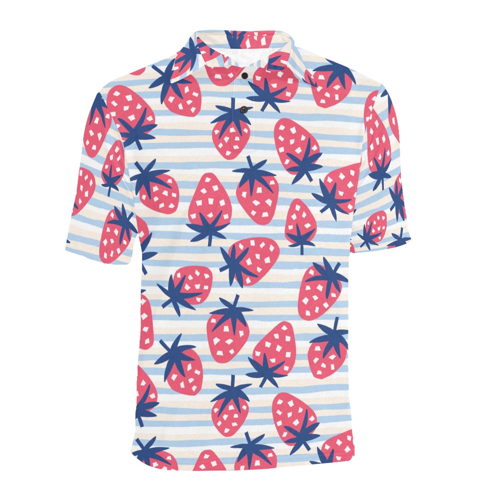 Strawberry pattern blue lines background Men's All Over Print Polo Shirt