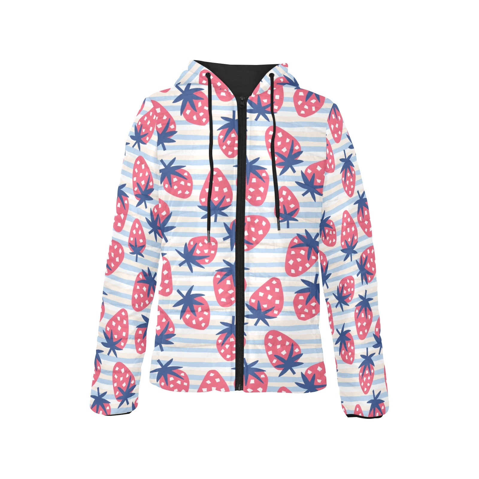 Strawberry pattern blue lines background Women's Padded Hooded Jacket