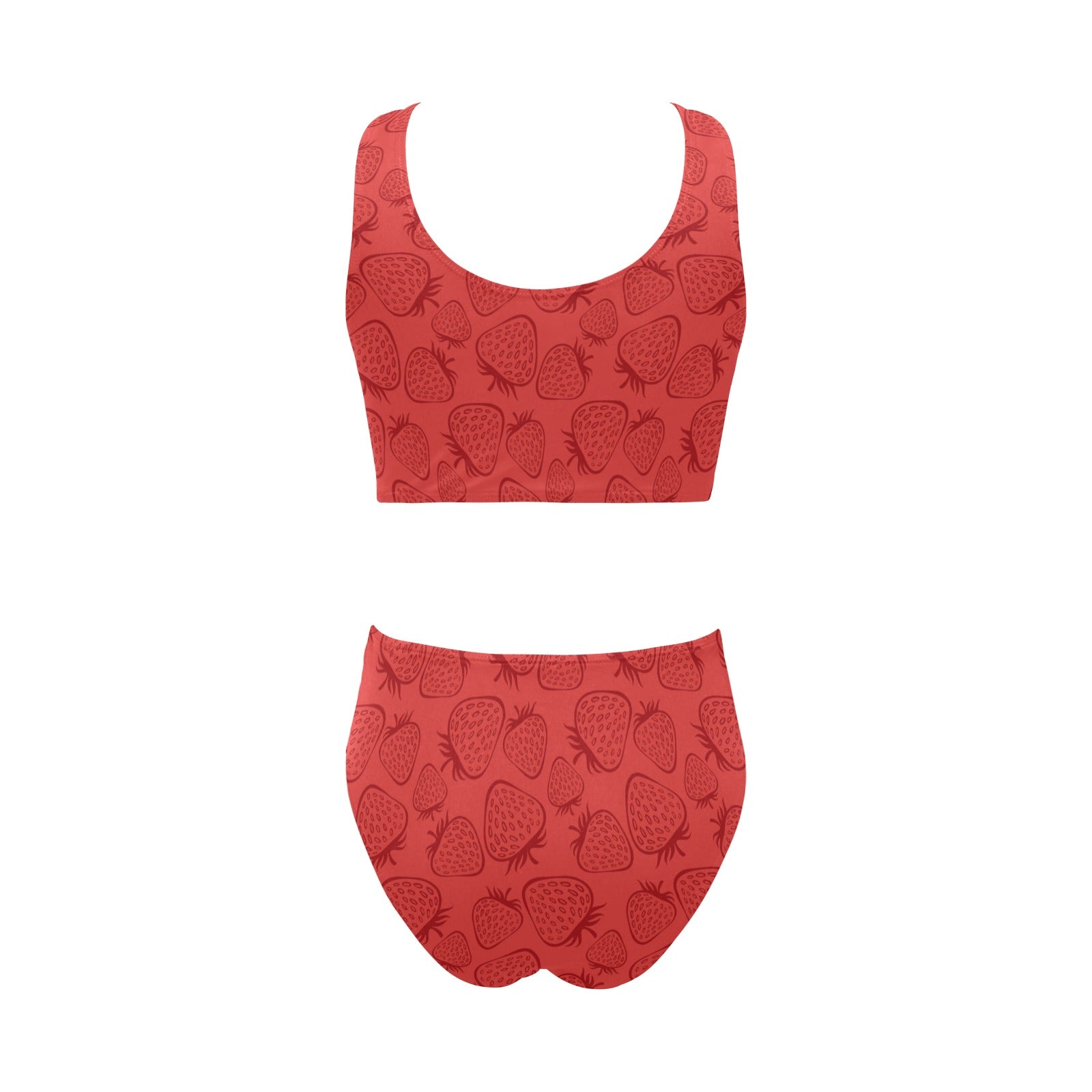 strawberry pattern red background Chest Bowknot High Waisted Bikini Swimsuit