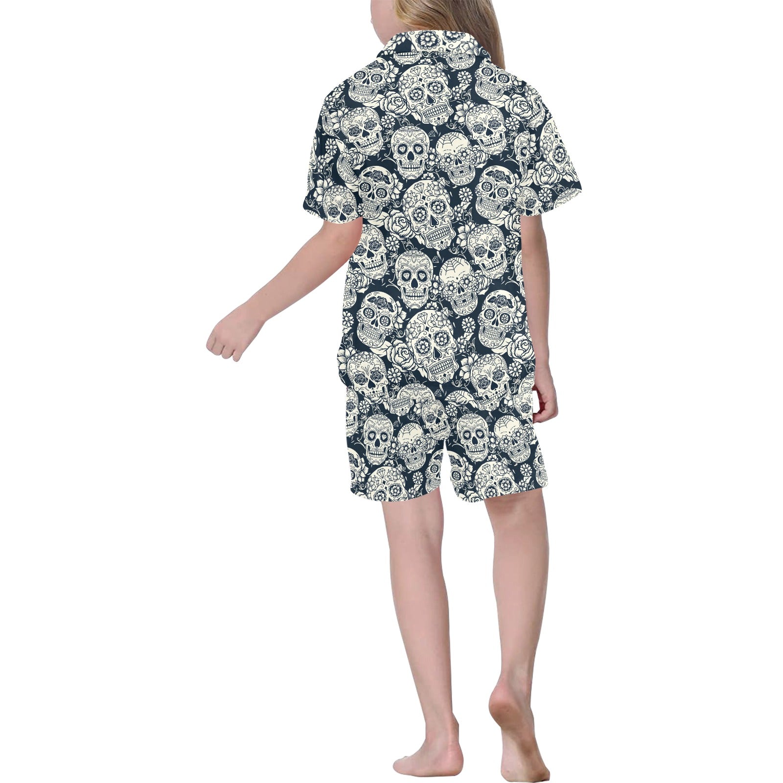 Sugar skull black white pattern Kids' Boys' Girls' V-Neck Short Pajama Set