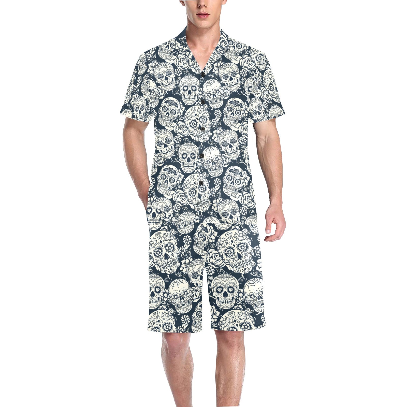 Sugar skull black white pattern Men's V-Neck Short Pajama Set