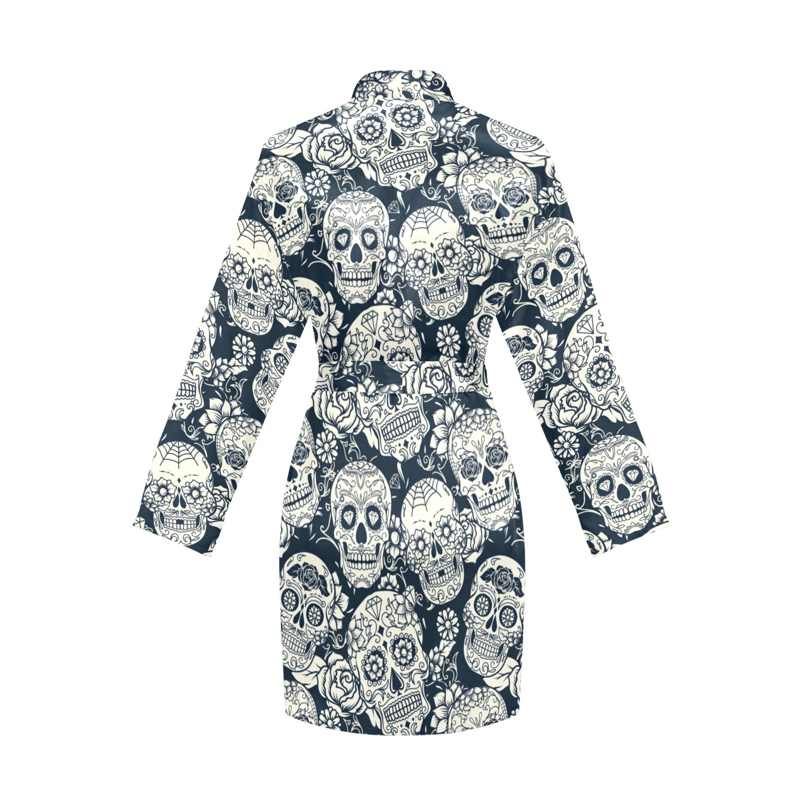 Sugar skull black white pattern Women's Long Sleeve Belted Night Robe