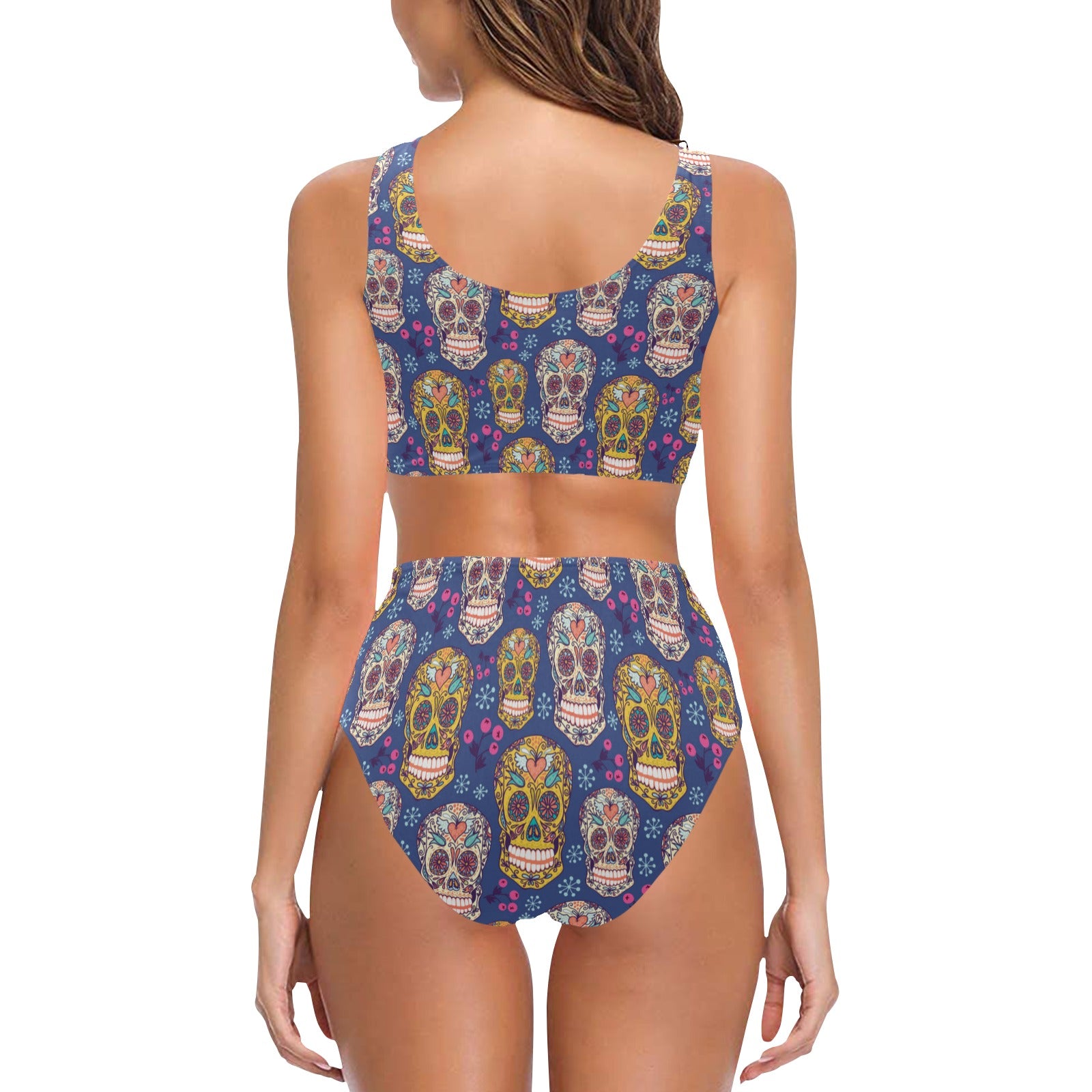 Sugar skull flower pattern Chest Bowknot High Waisted Bikini Swimsuit