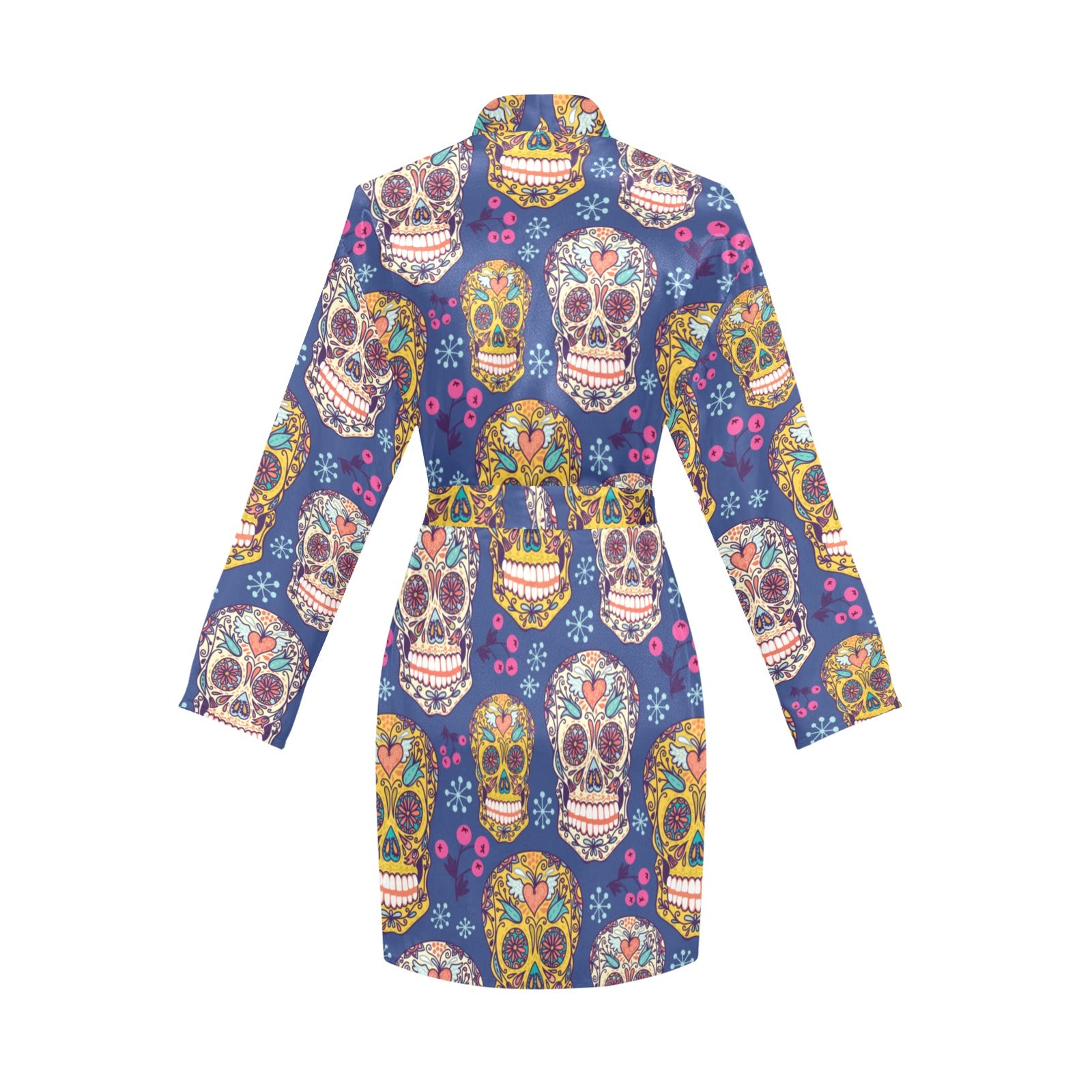 Sugar skull flower pattern Women's Long Sleeve Belted Night Robe