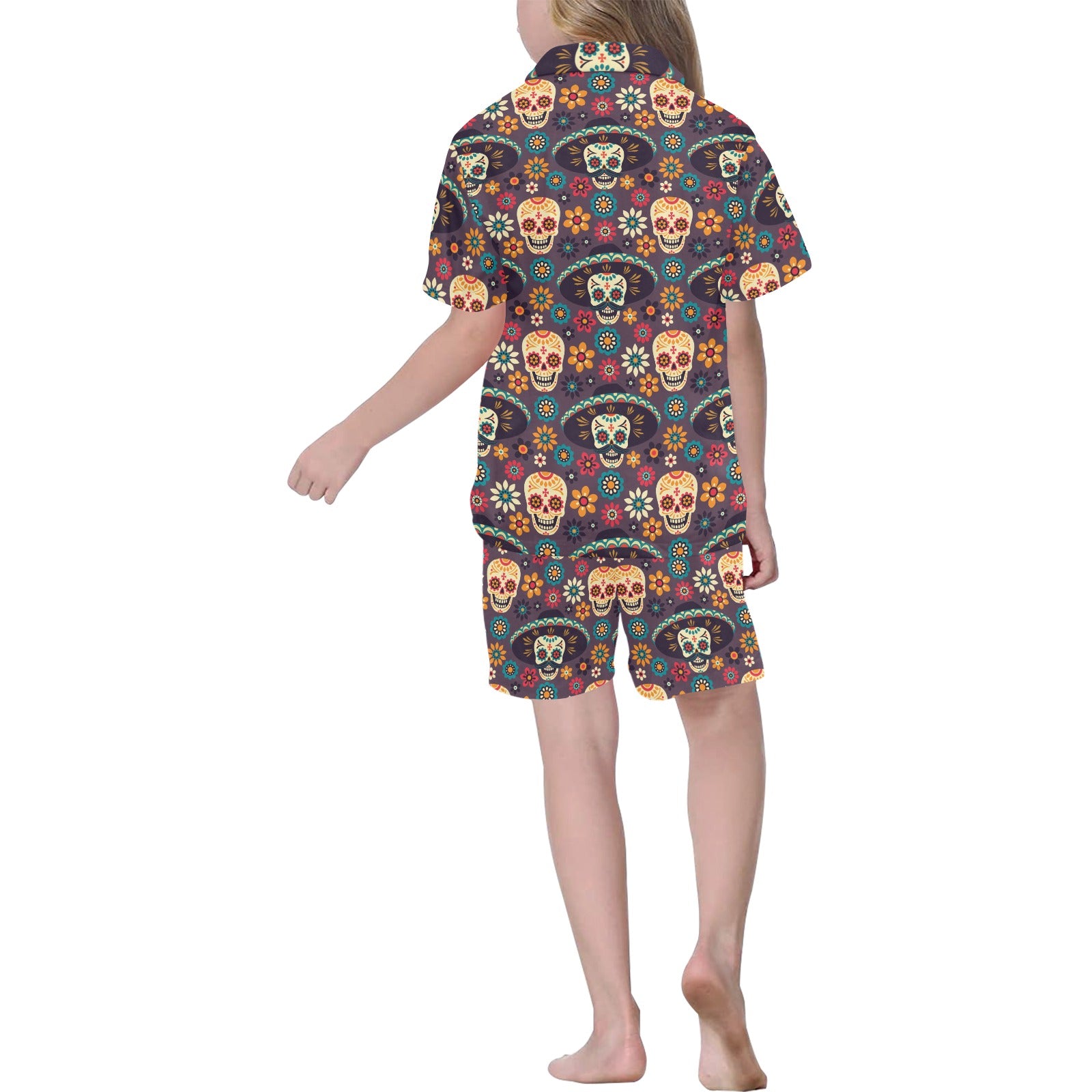 Sugar skulls flower maxican pattern Kids' Boys' Girls' V-Neck Short Pajama Set
