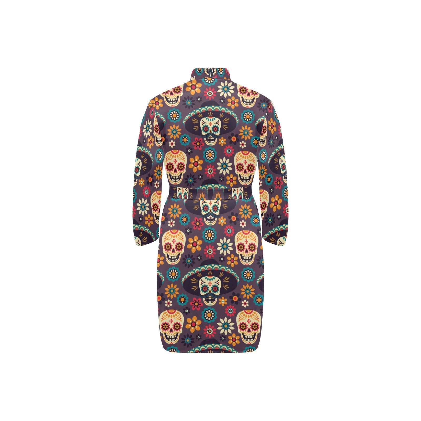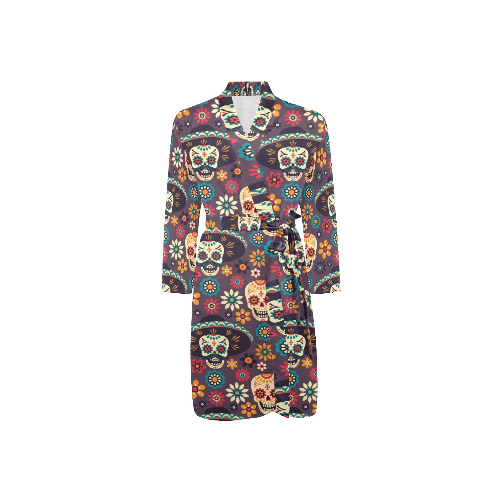 Sugar skulls flower maxican pattern Men's Long Sleeve Belted Night Robe