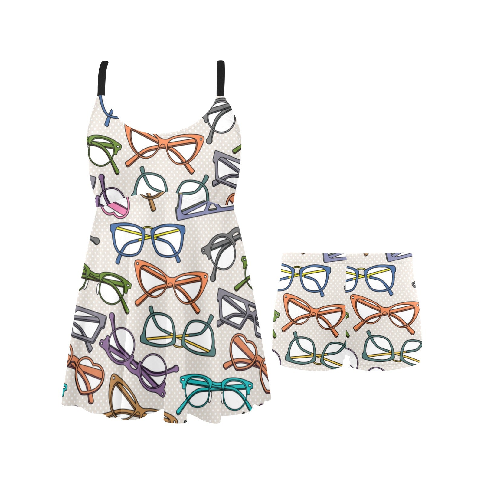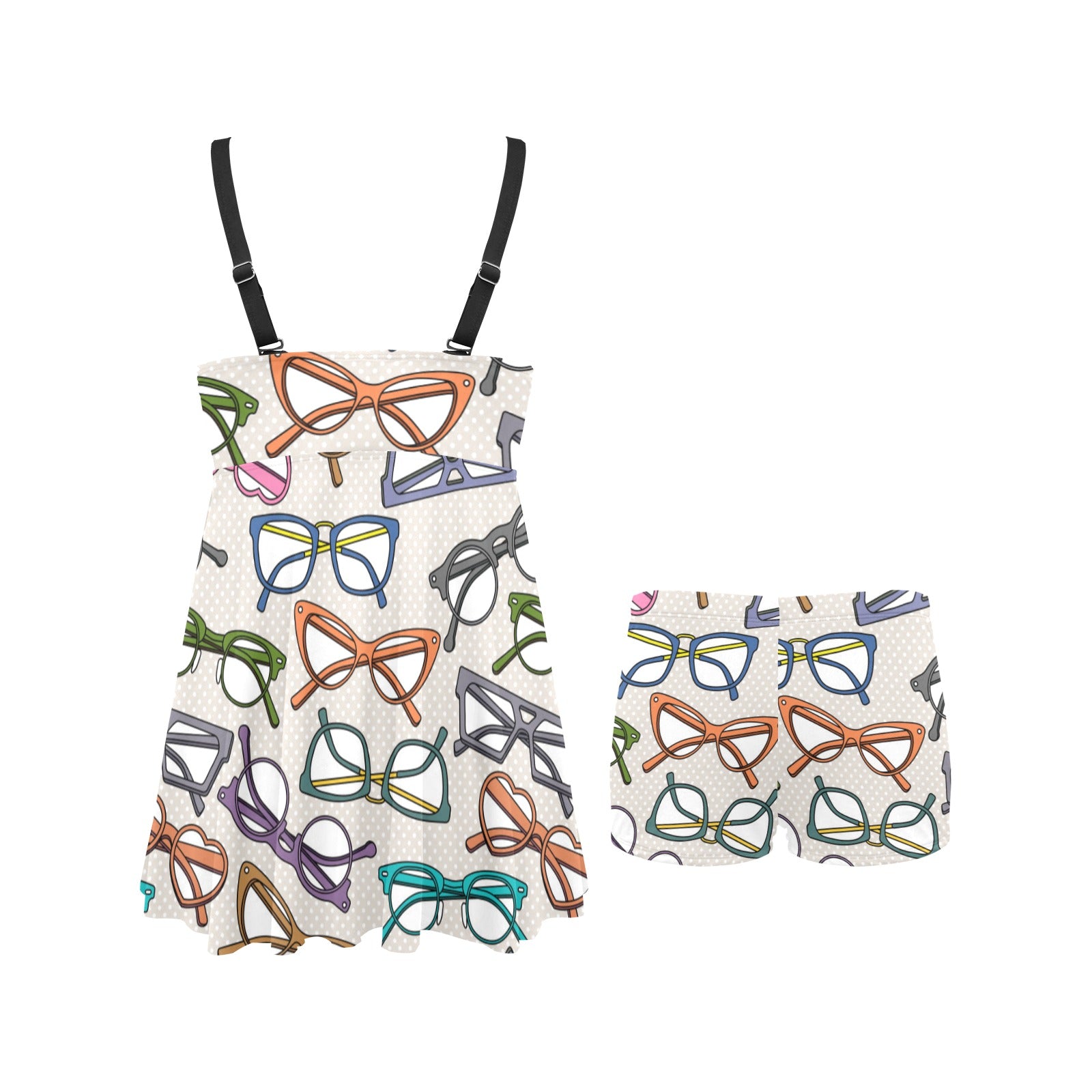 Sun Glasses Pattern Print Design 01 Chest Sexy Pleated Two Piece Swim Dress