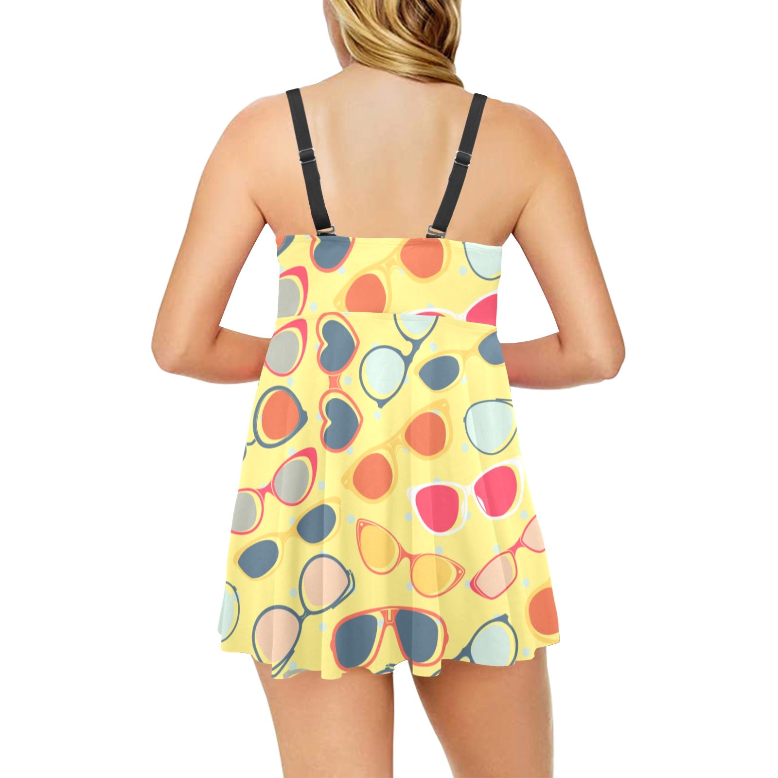 Sun Glasses Pattern Print Design 05 Chest Sexy Pleated Two Piece Swim Dress