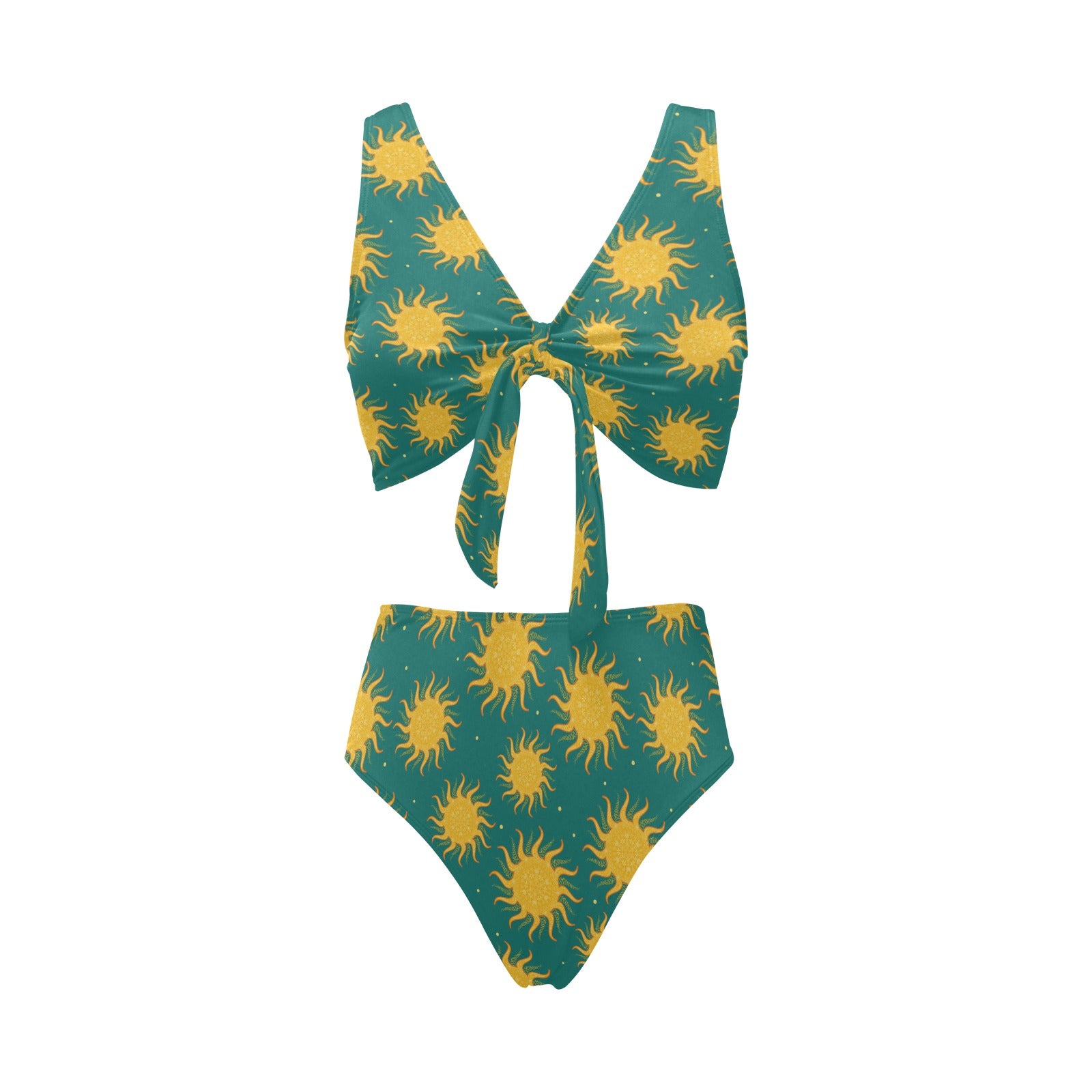 Sun green background Chest Bowknot High Waisted Bikini Swimsuit