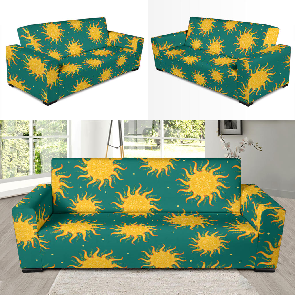 Sun green background Sofa Slipcover is a uniqued design and limited item. It made to order, hand printed, and sewn with love in our factory.