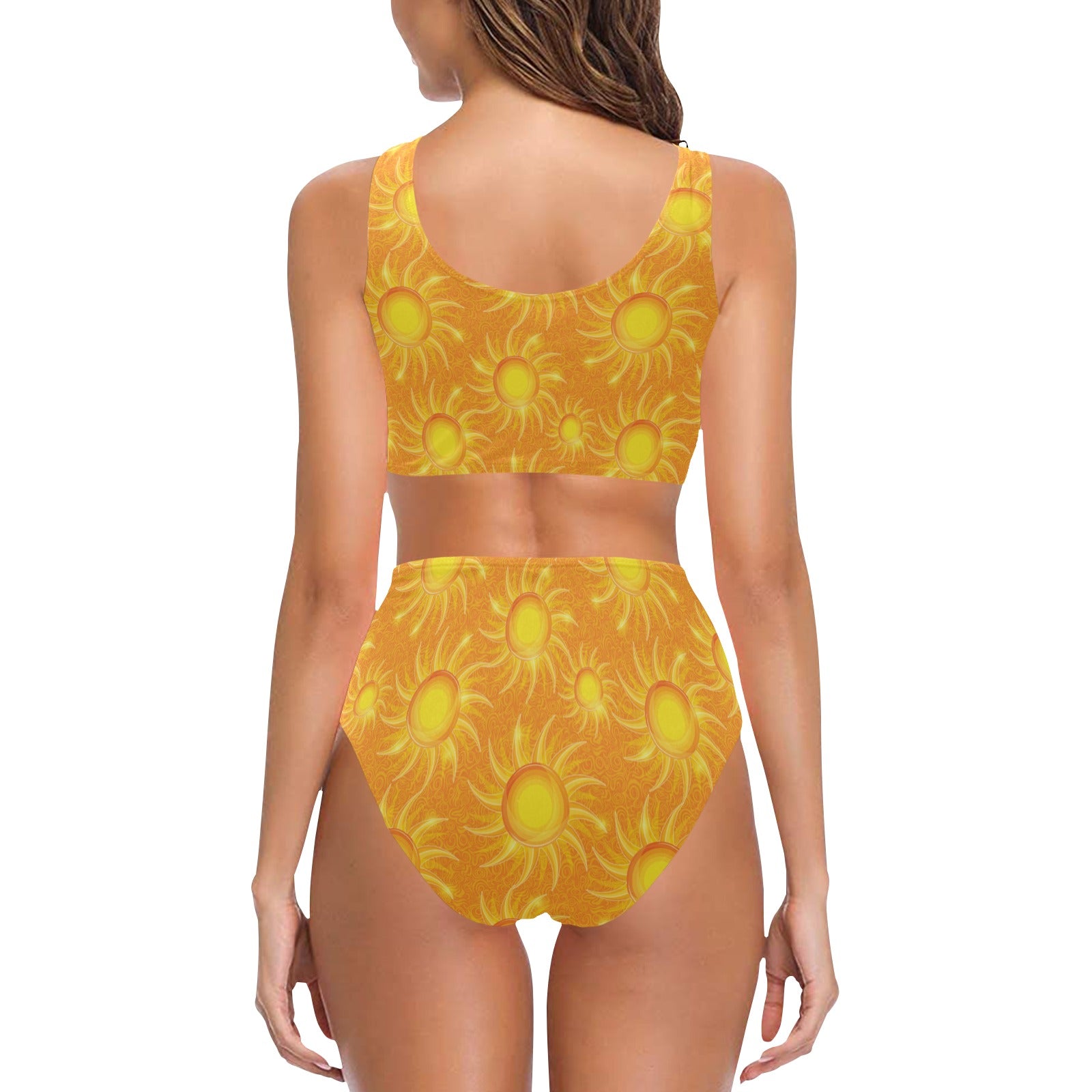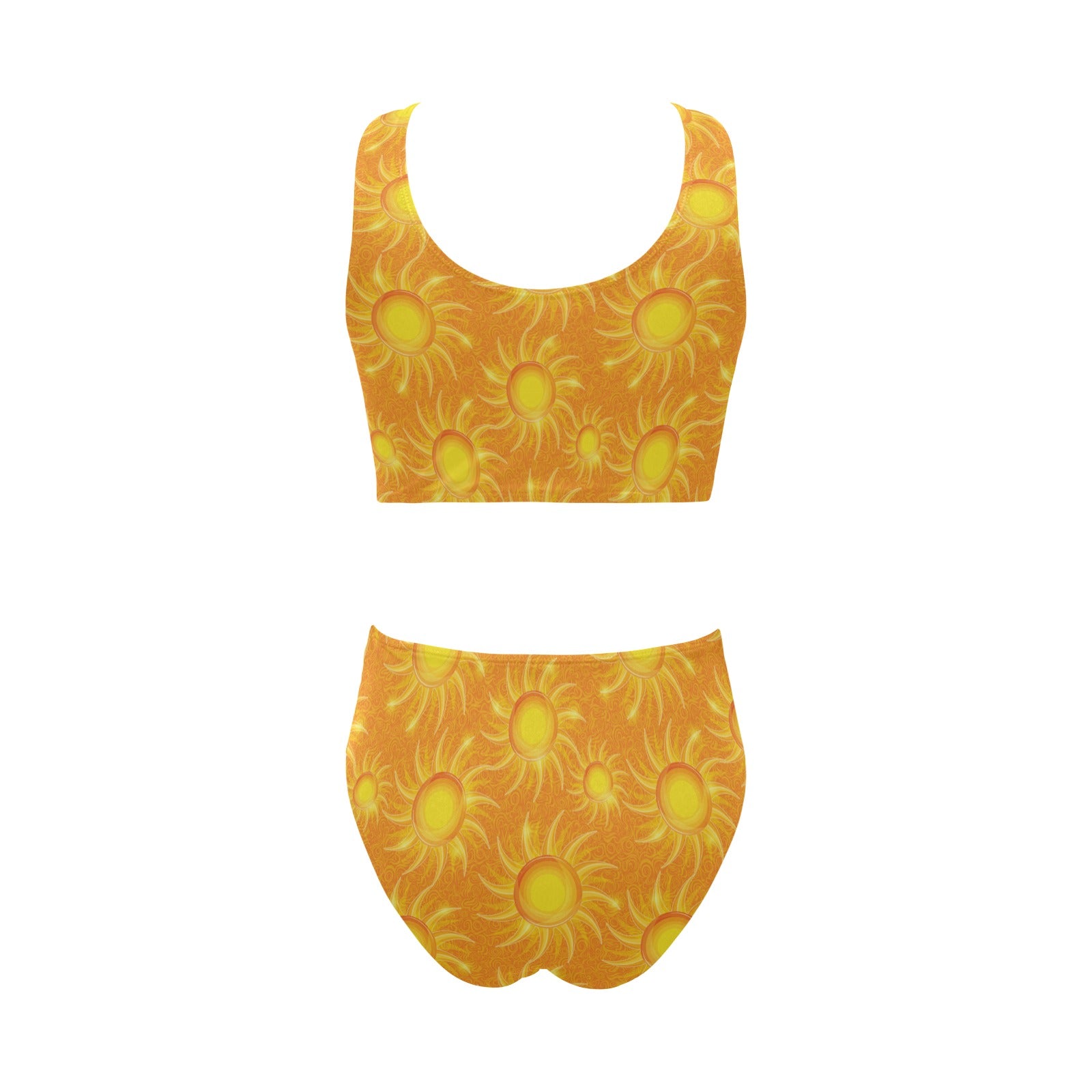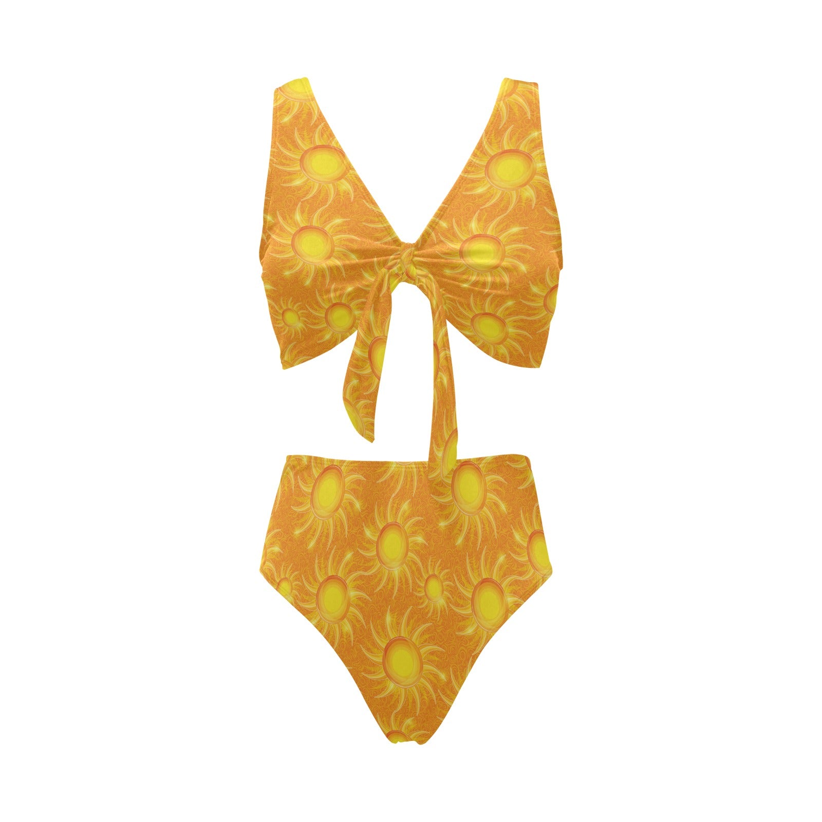 Sun orange background Chest Bowknot High Waisted Bikini Swimsuit