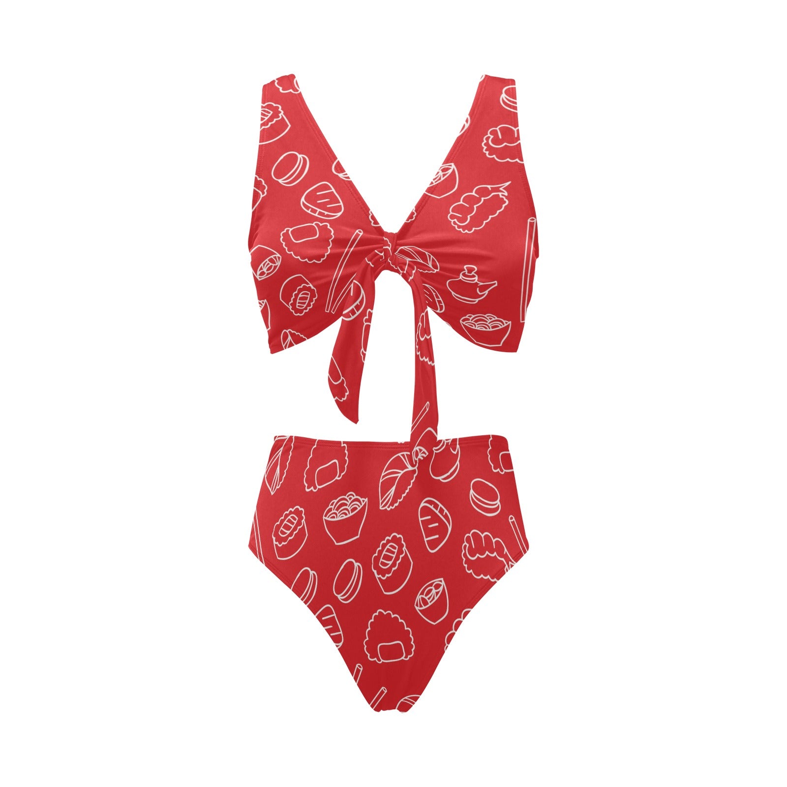 sushi pattern red background Chest Bowknot High Waisted Bikini Swimsuit