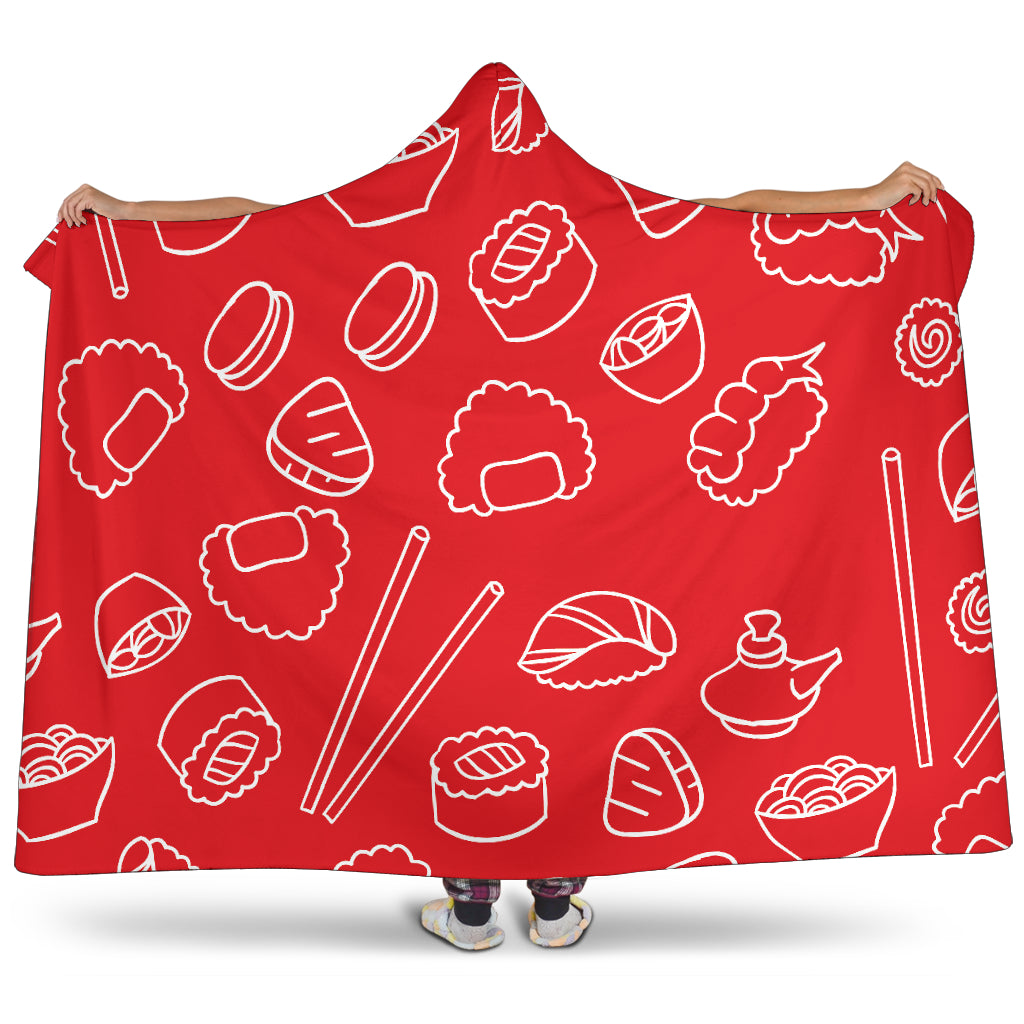 sushi pattern red background Hooded Blanket are custom-made-to-order and handcrafted to the highest quality standards.