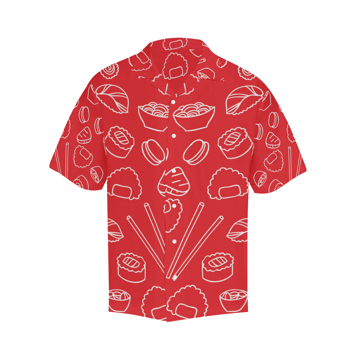 sushi pattern red background Men's All Over Print Hawaiian Shirt is a uniqued design and limited item. It made to order, hand printed, and sewn with love in our factory.