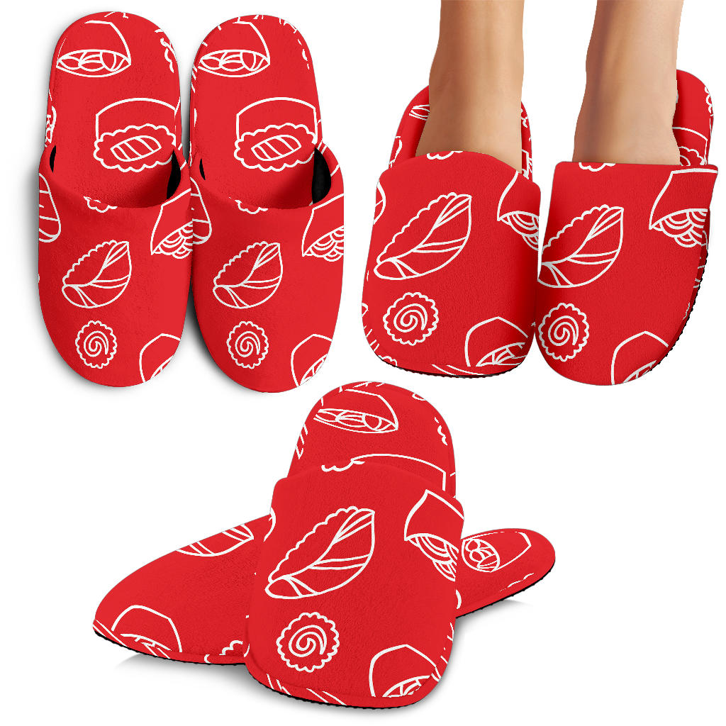 sushi pattern red background Slippers are uniqued design and limited item. It made to order, hand printed, and sewn with love in our factory.