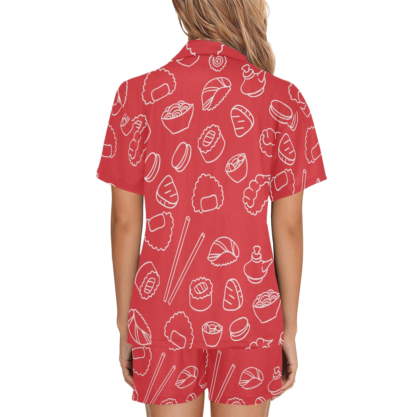 sushi pattern red background Women's V-Neck Short Pajama Set