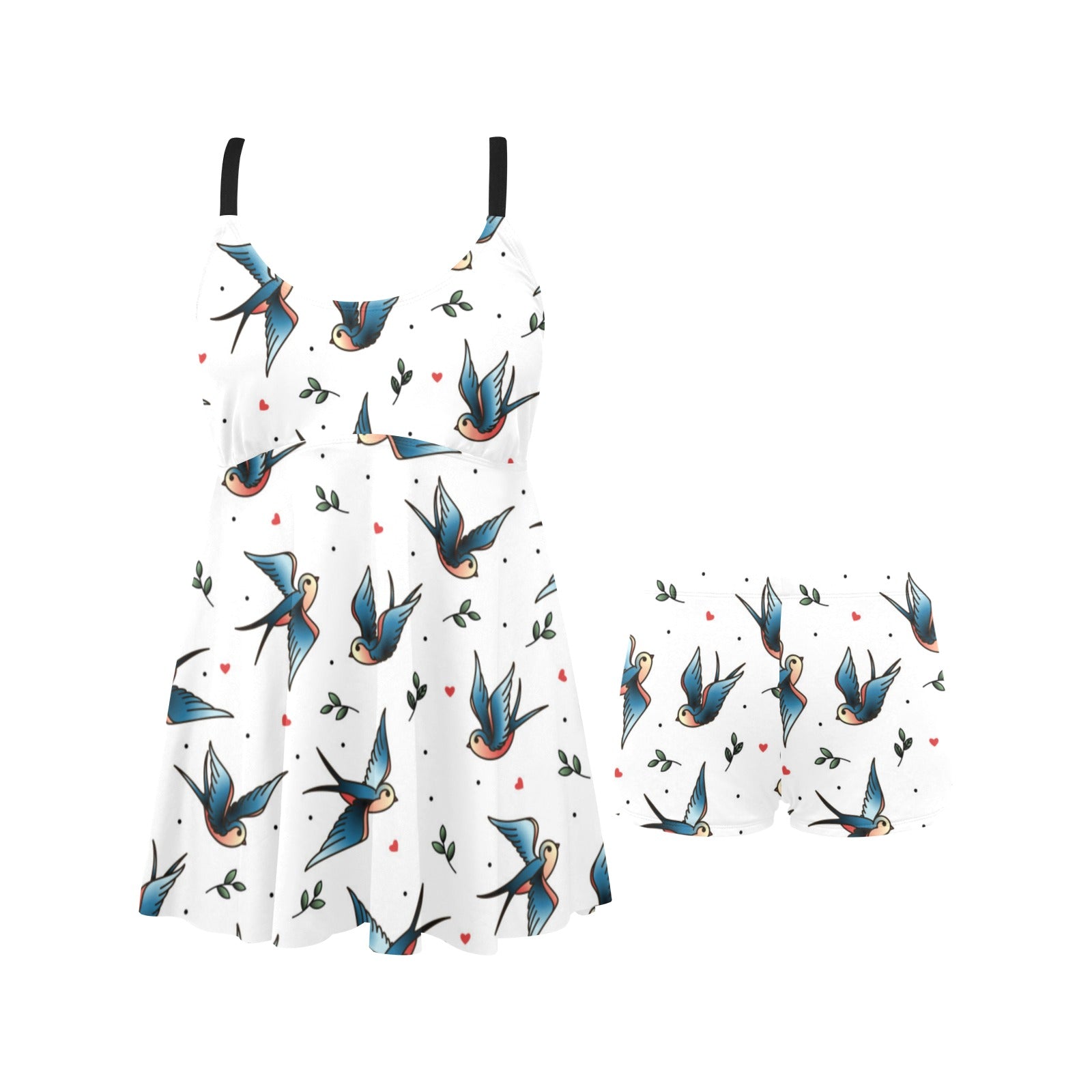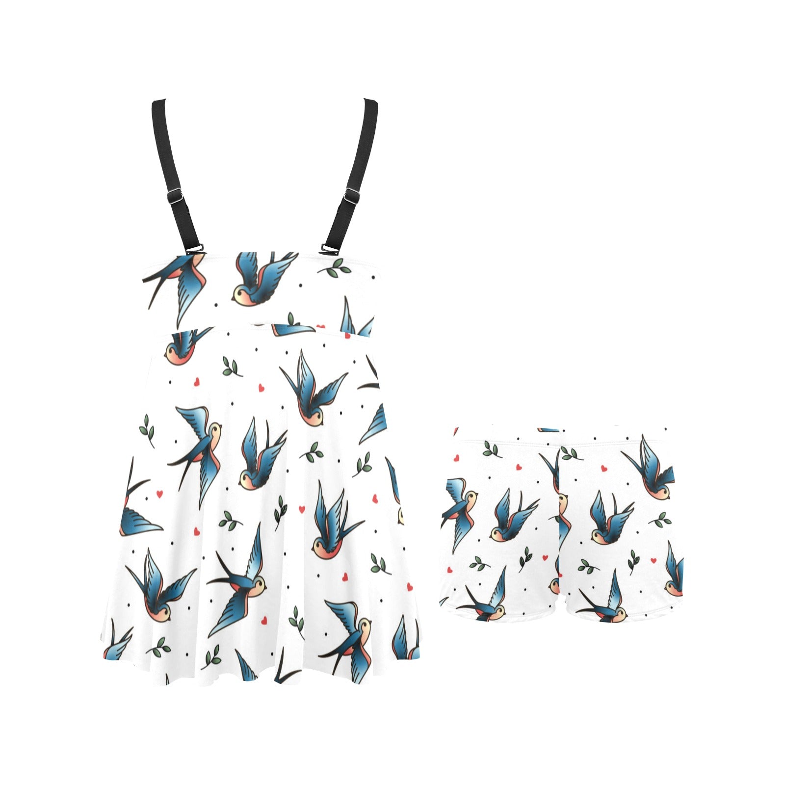 Swallow Pattern Print Design 04 Chest Sexy Pleated Two Piece Swim Dress