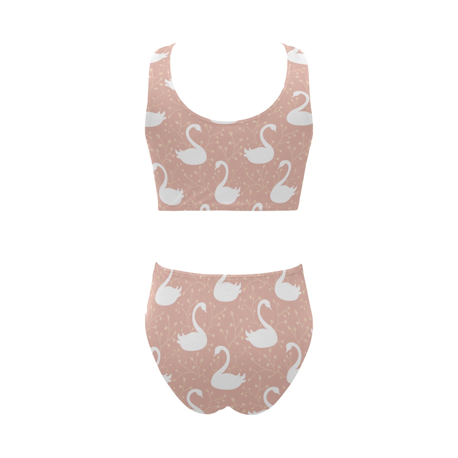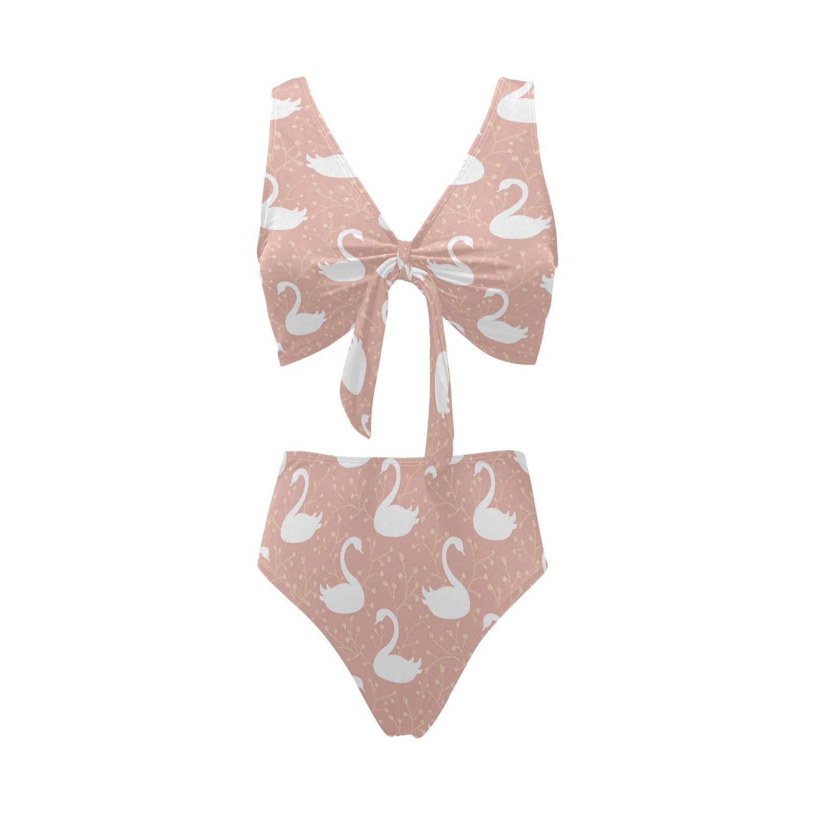 Swan flower light pink background Chest Bowknot High Waisted Bikini Swimsuit