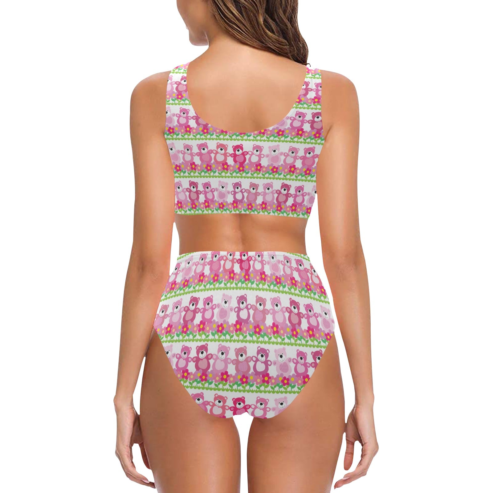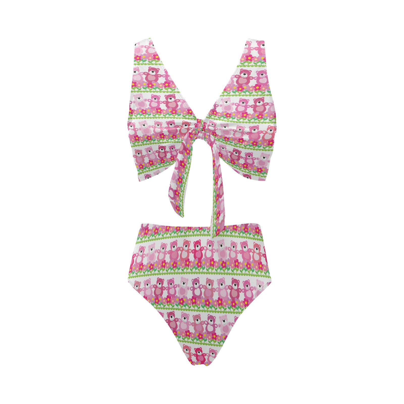 Teddy Bear Pattern Print Design 04 Chest Bowknot High Waisted Bikini Swimsuit