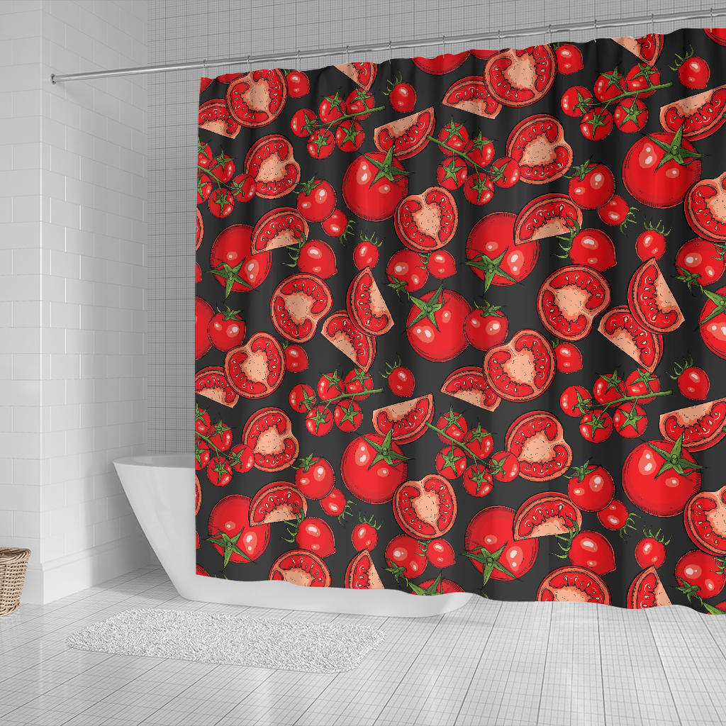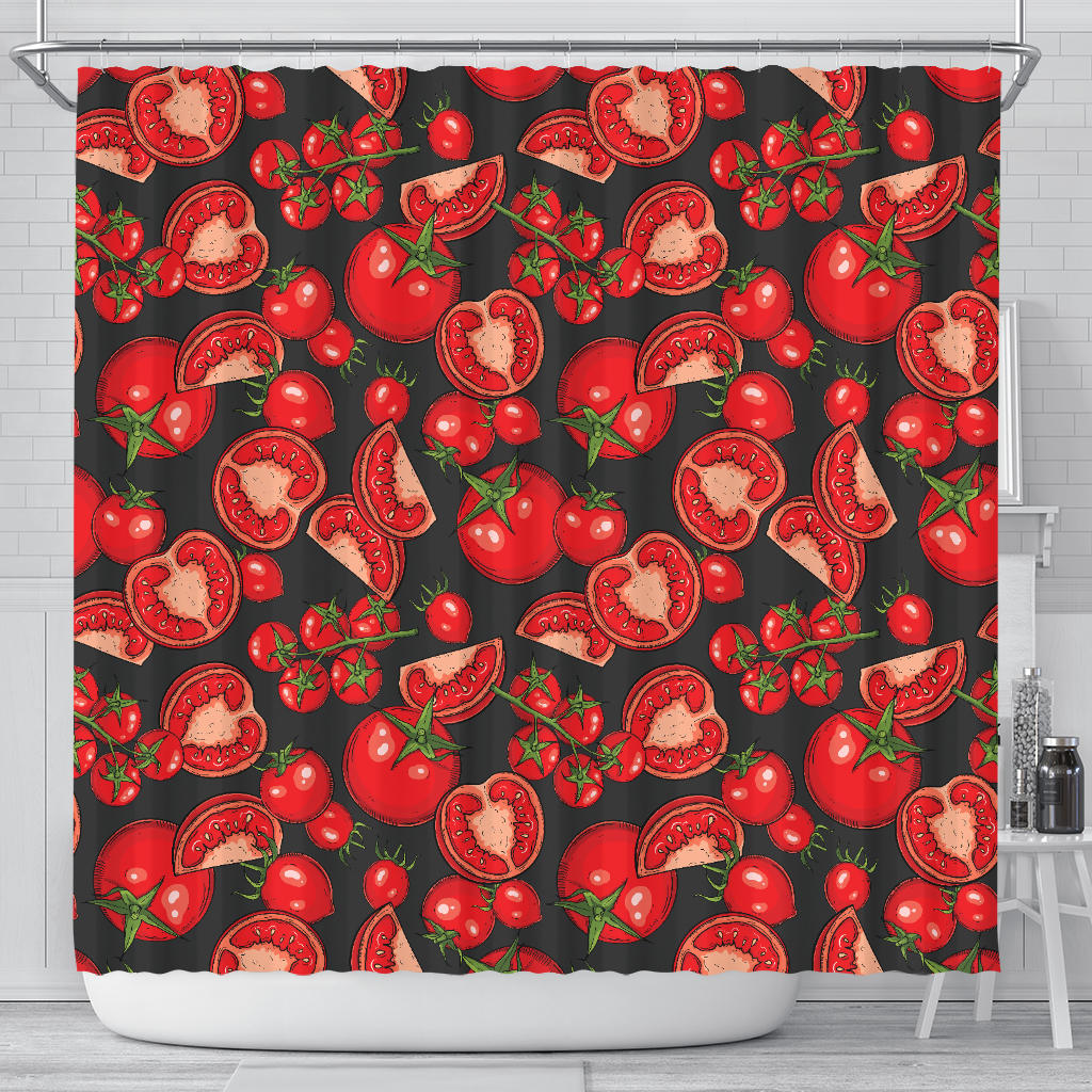 Tomato black background Shower Curtain is a uniqued design and limited item. It made to order, hand printed, and sewn with love in our factory.
