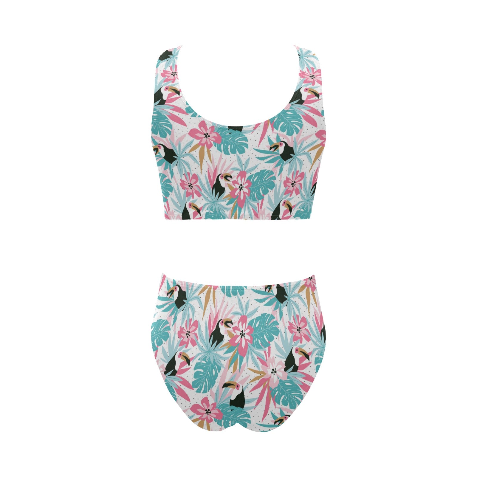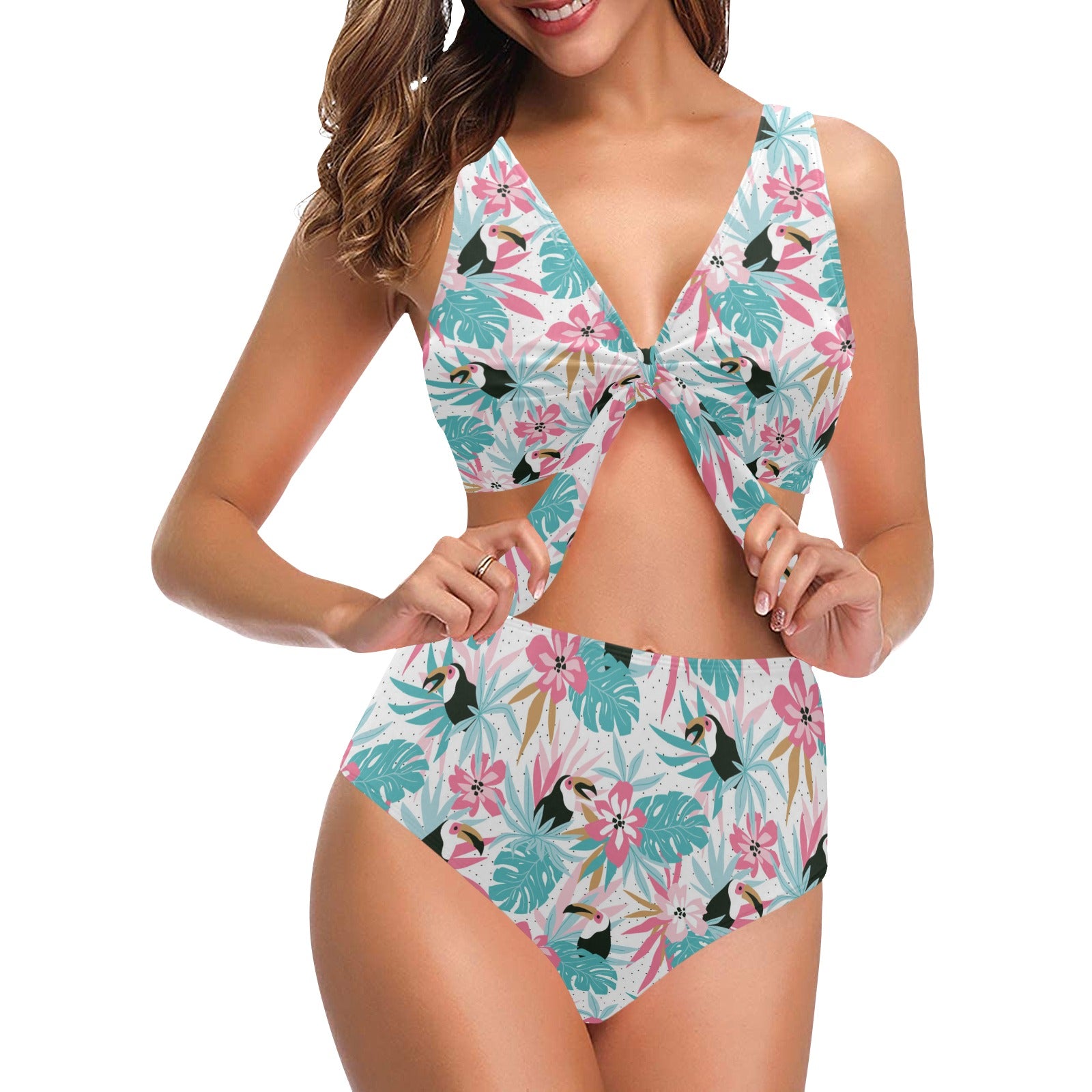 Toucan tropical flower leave pattern Chest Bowknot High Waisted Bikini Swimsuit