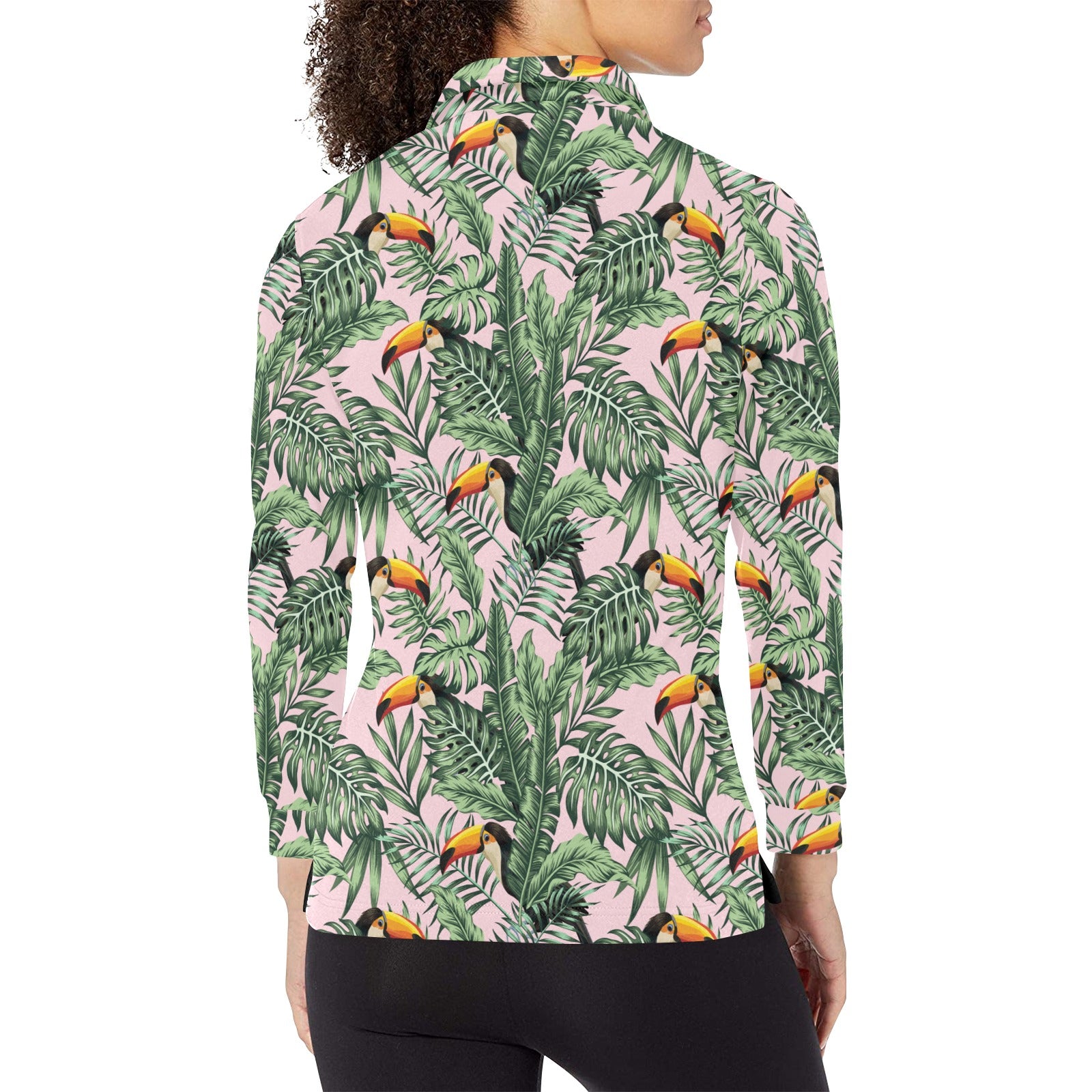 Toucan tropical green jungle palm pattern Women's Long Sleeve Polo Shirt