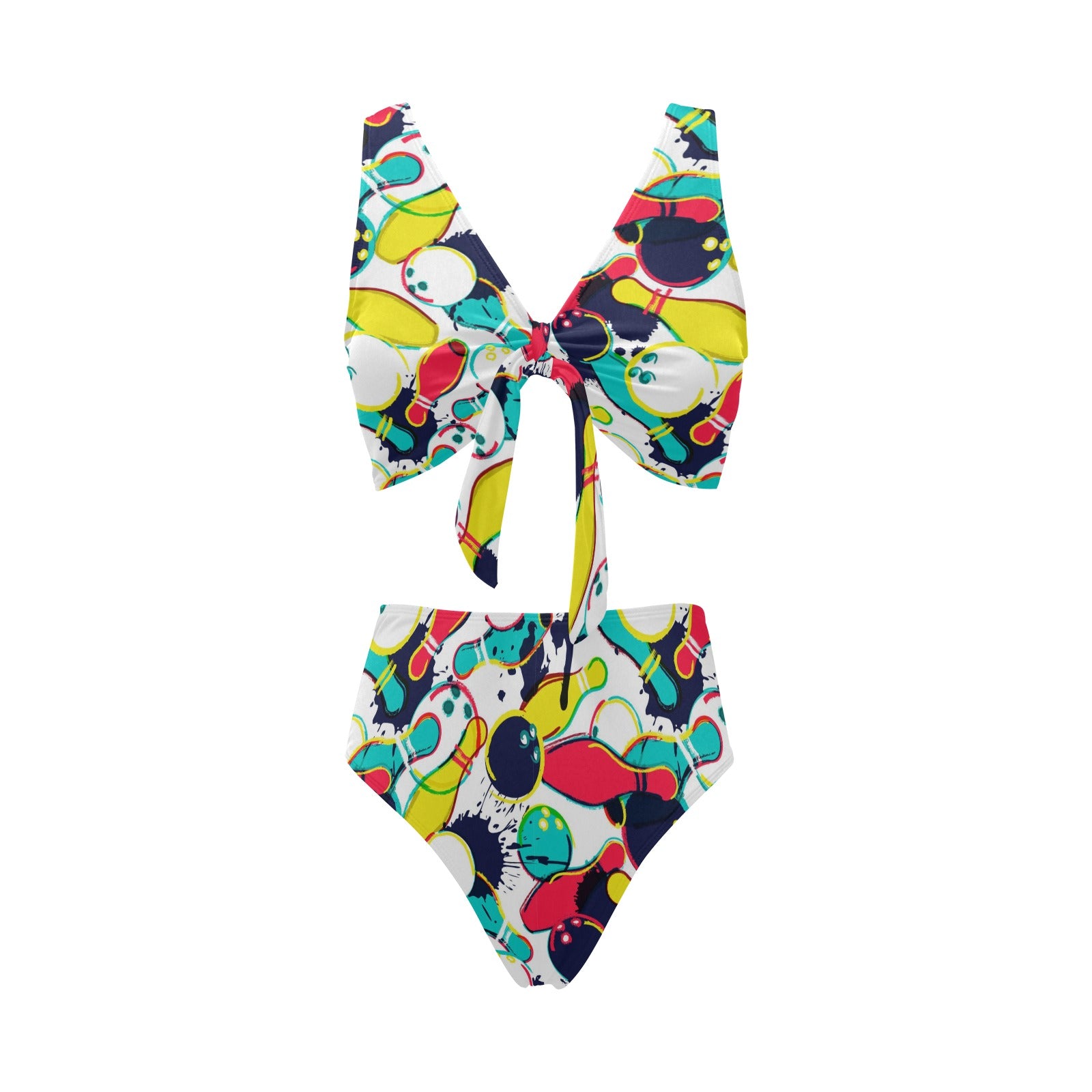 watercolor bowling ball pins Chest Bowknot High Waisted Bikini Swimsuit