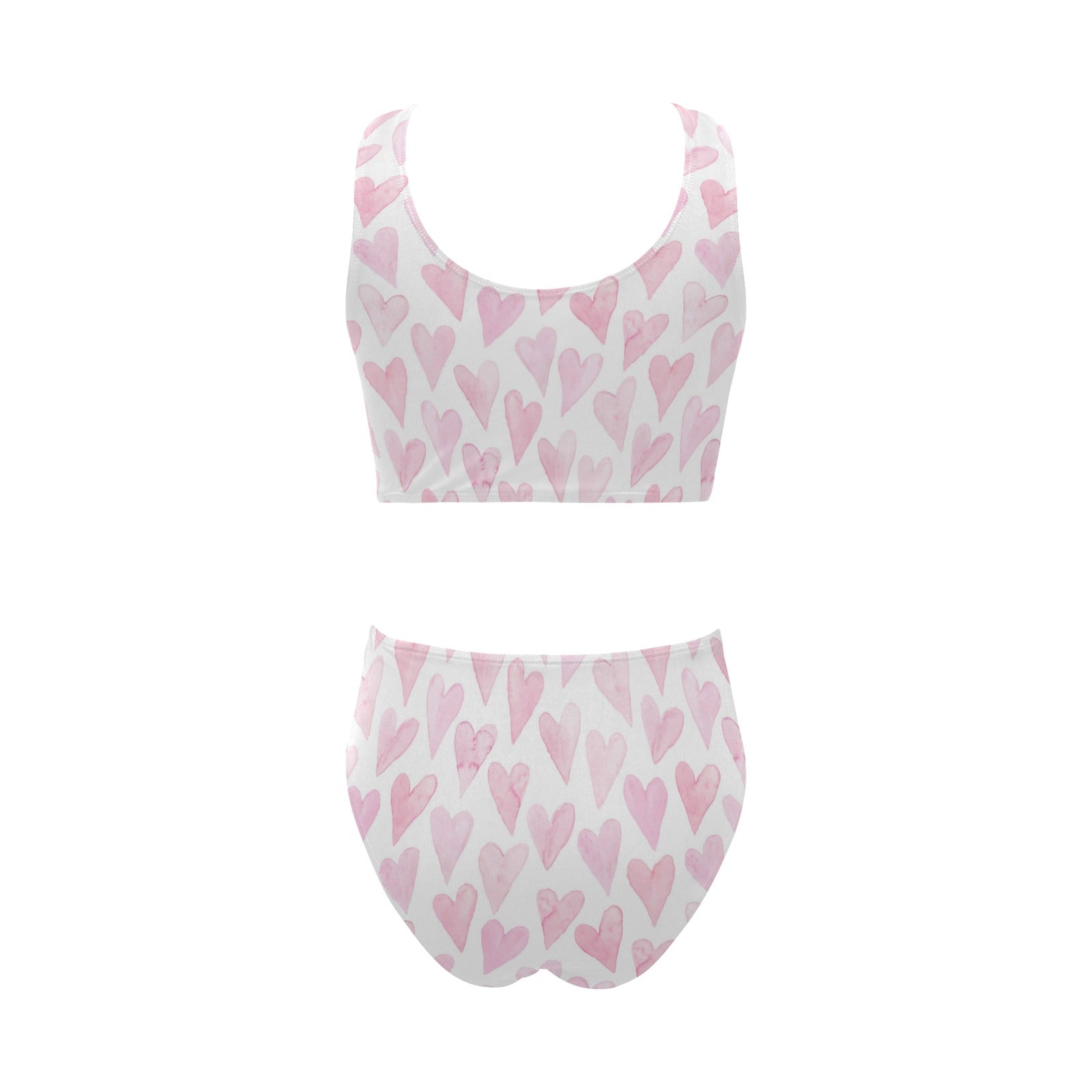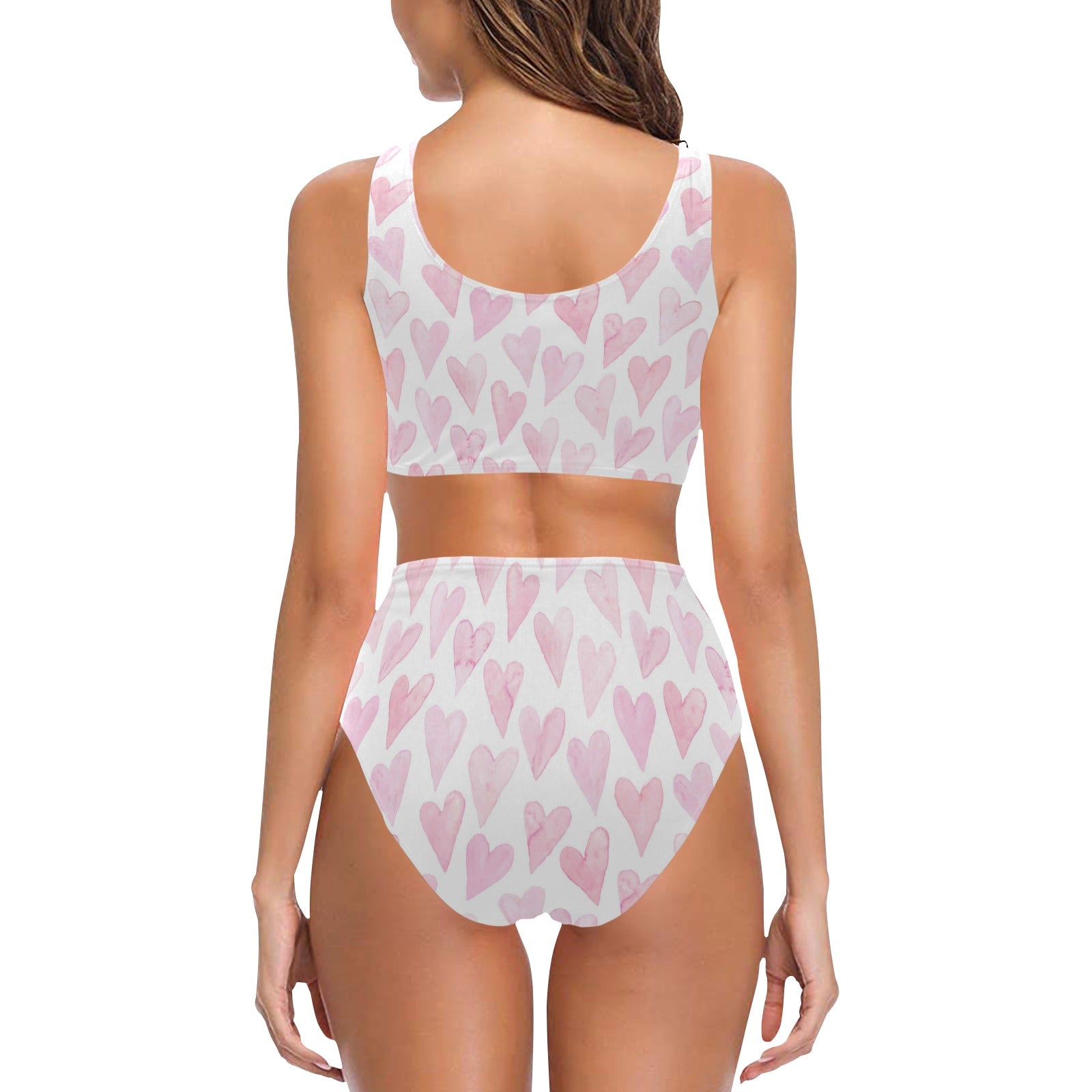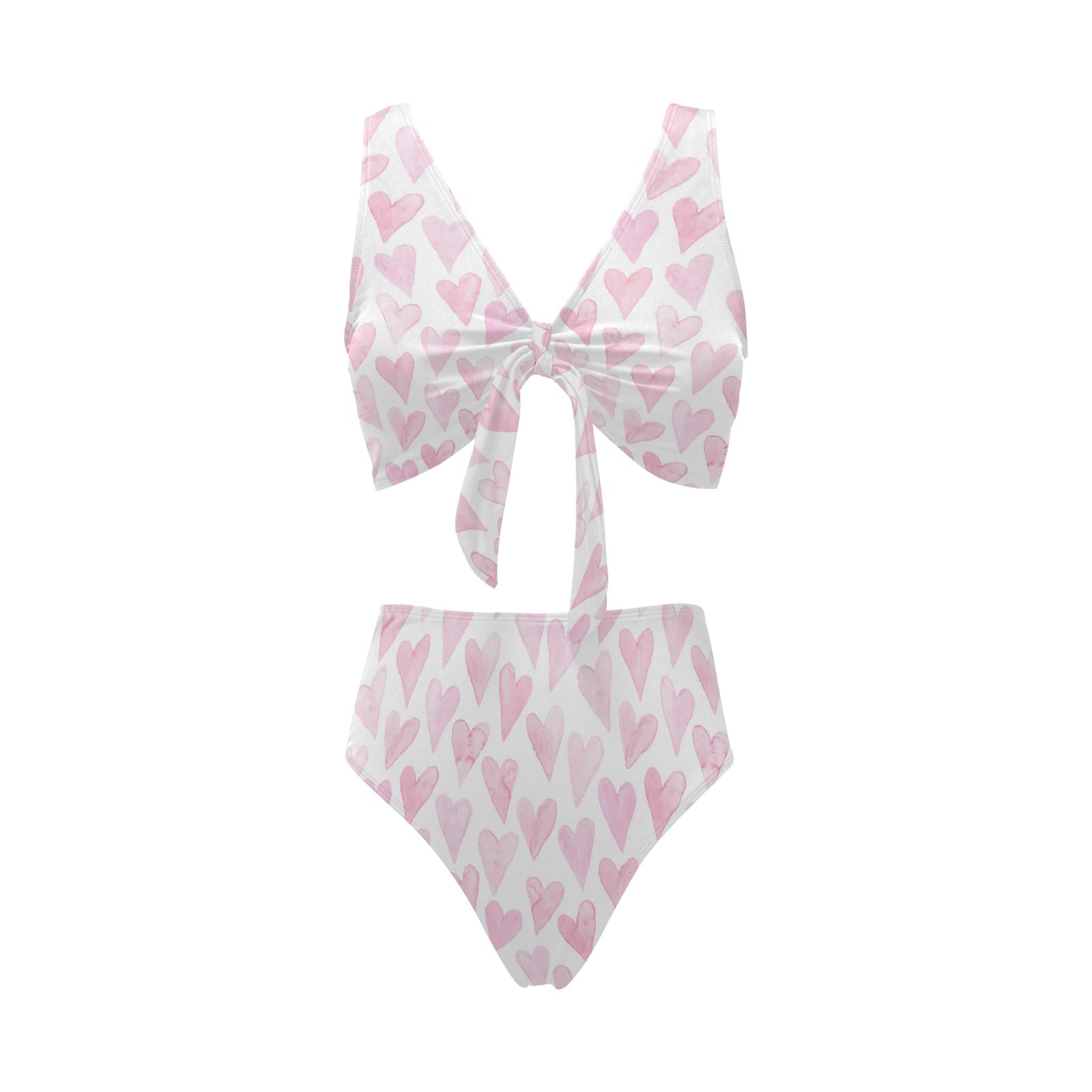 Watercolor pink heart pattern Chest Bowknot High Waisted Bikini Swimsuit