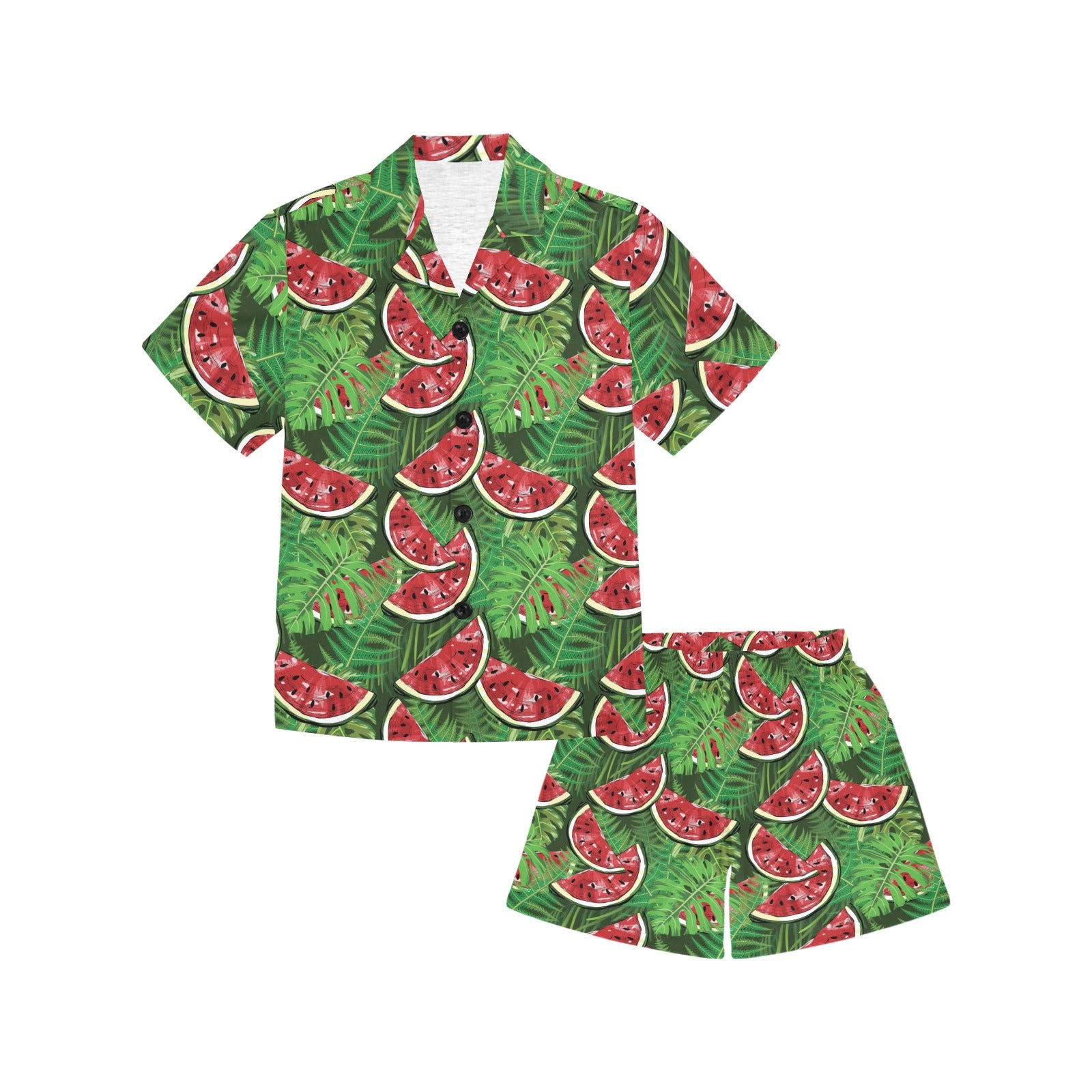 Watermelons tropical palm leaves pattern backgroun Kids' Boys' Girls' V-Neck Short Pajama Set