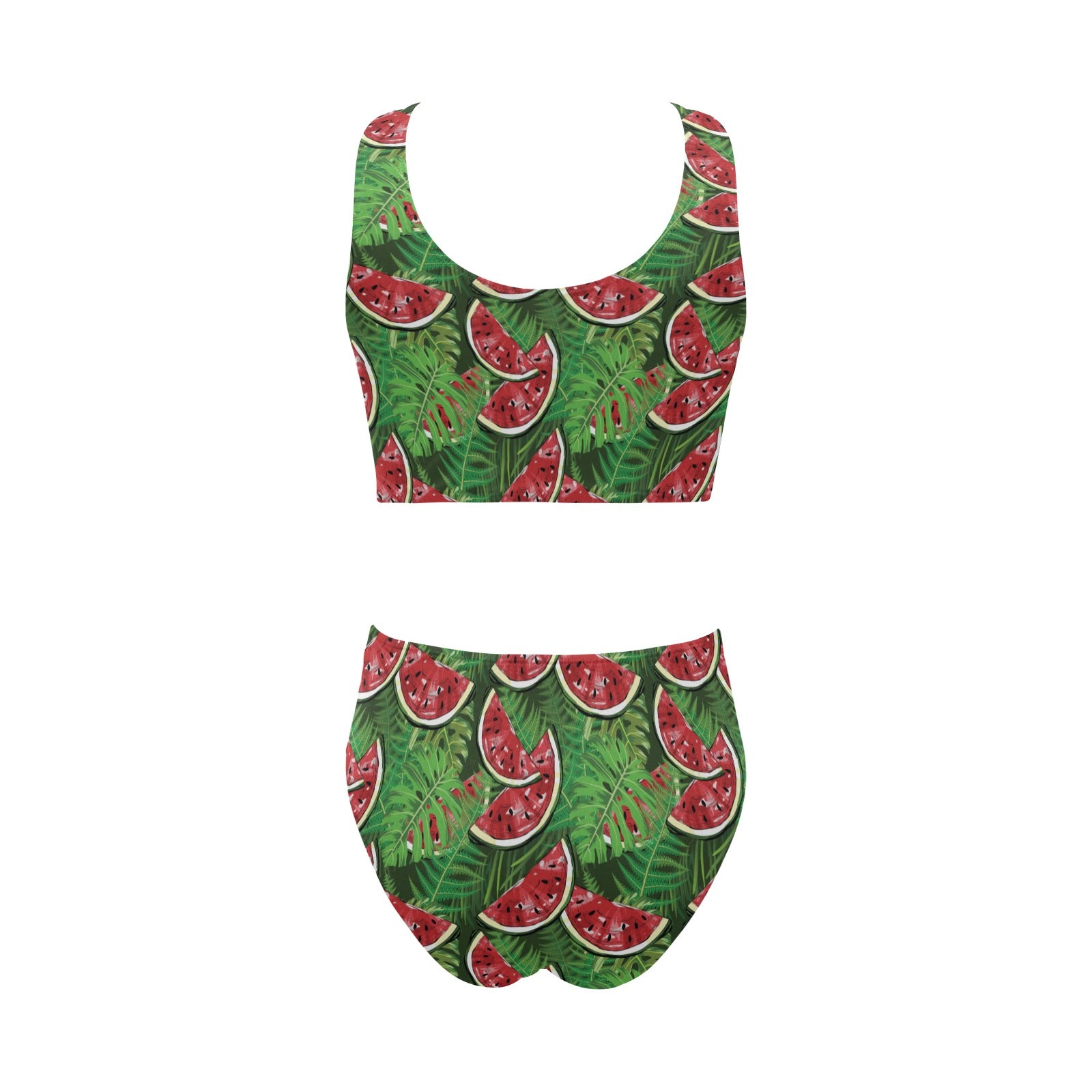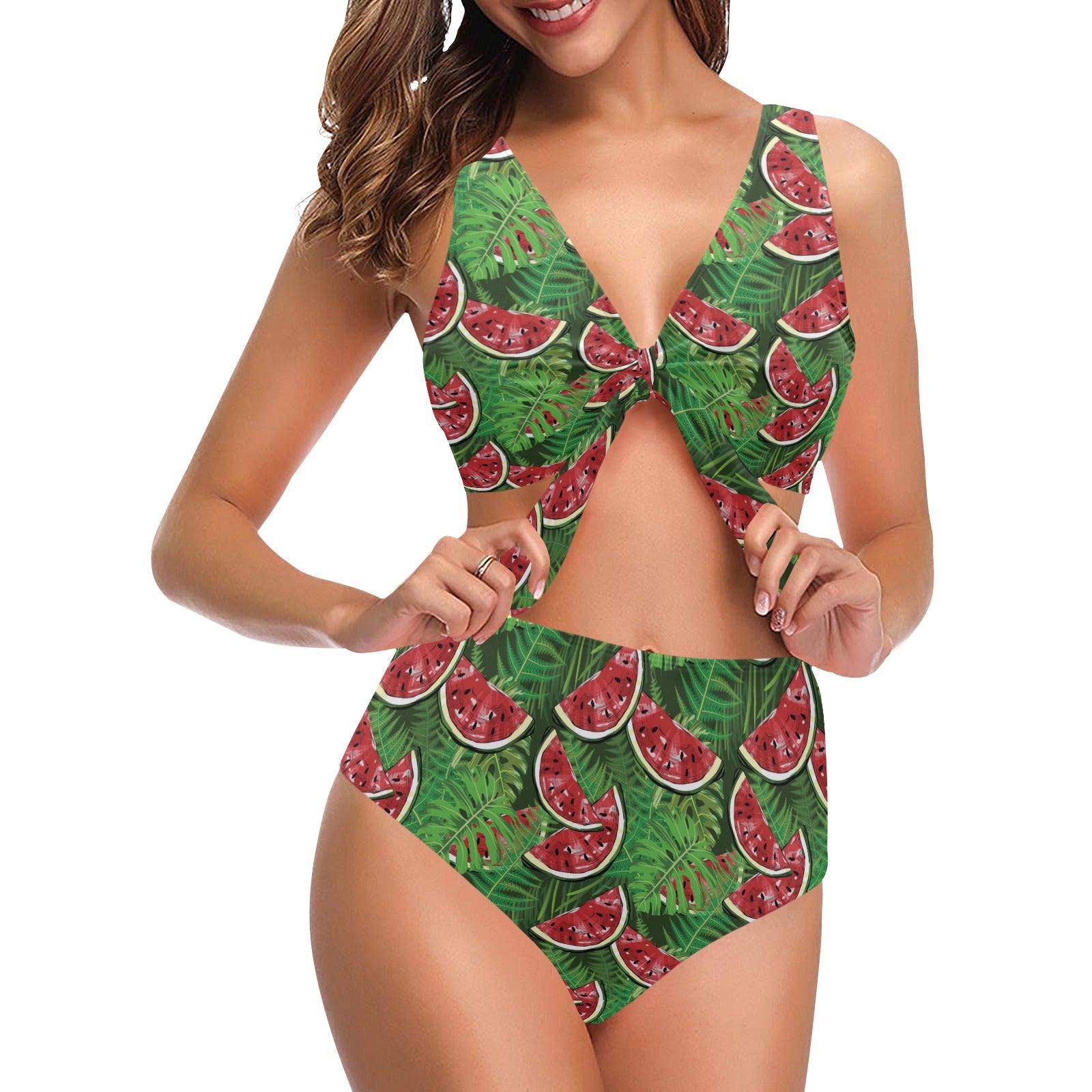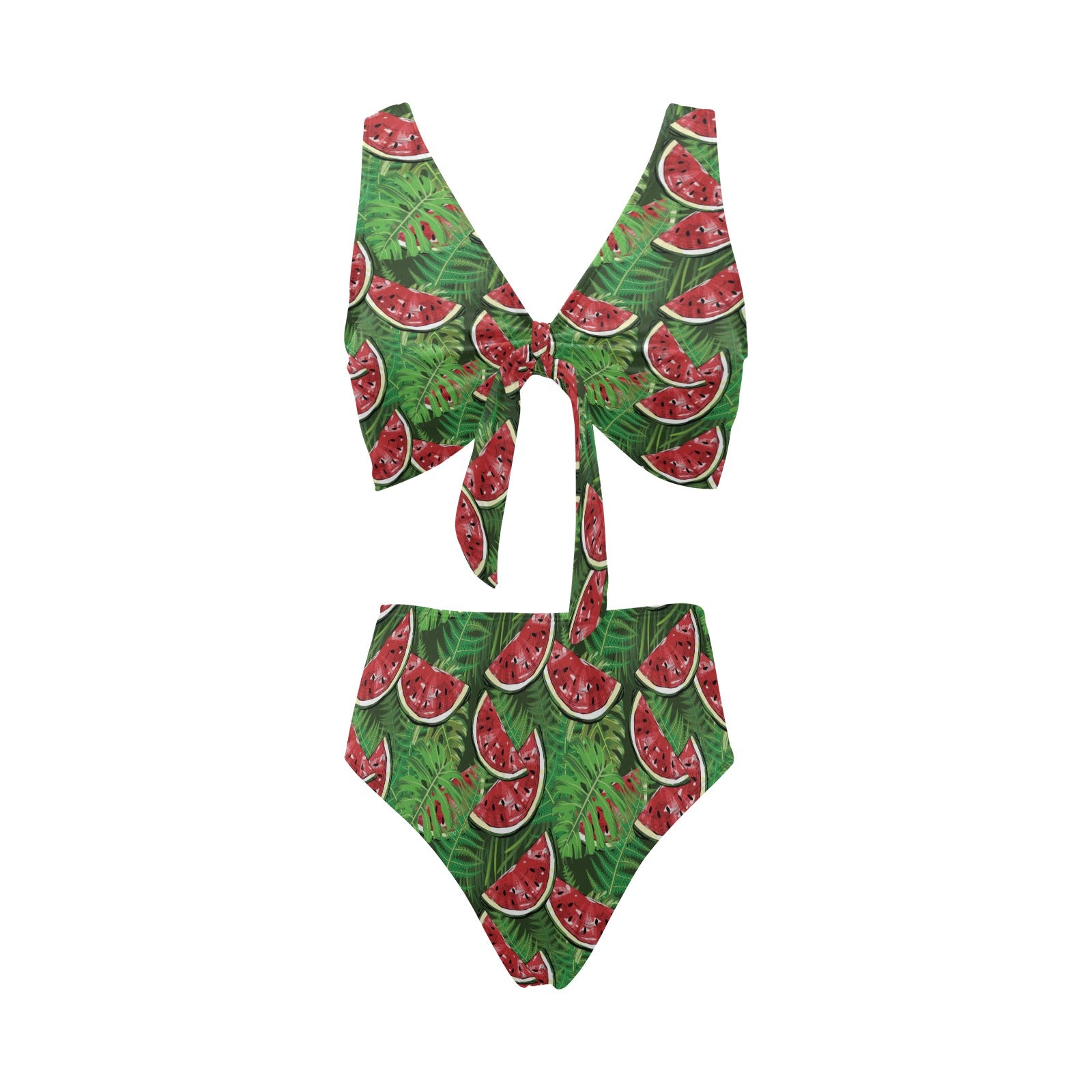 Watermelons tropical palm leaves pattern backgroun Chest Bowknot High Waisted Bikini Swimsuit
