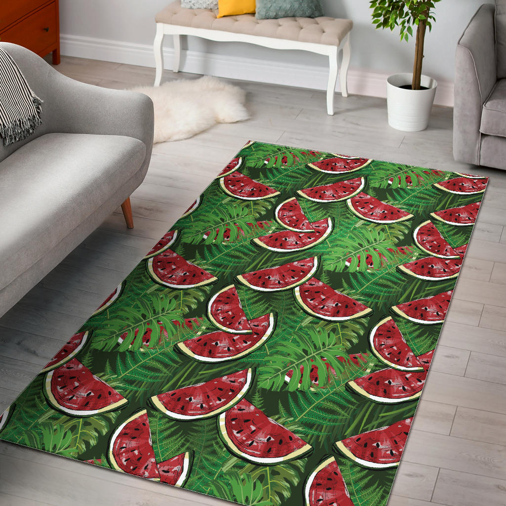 Watermelons tropical palm leaves pattern background Area Rug is a uniqued design and limited item. It made to order, hand printed, and sewn with love in our factory.