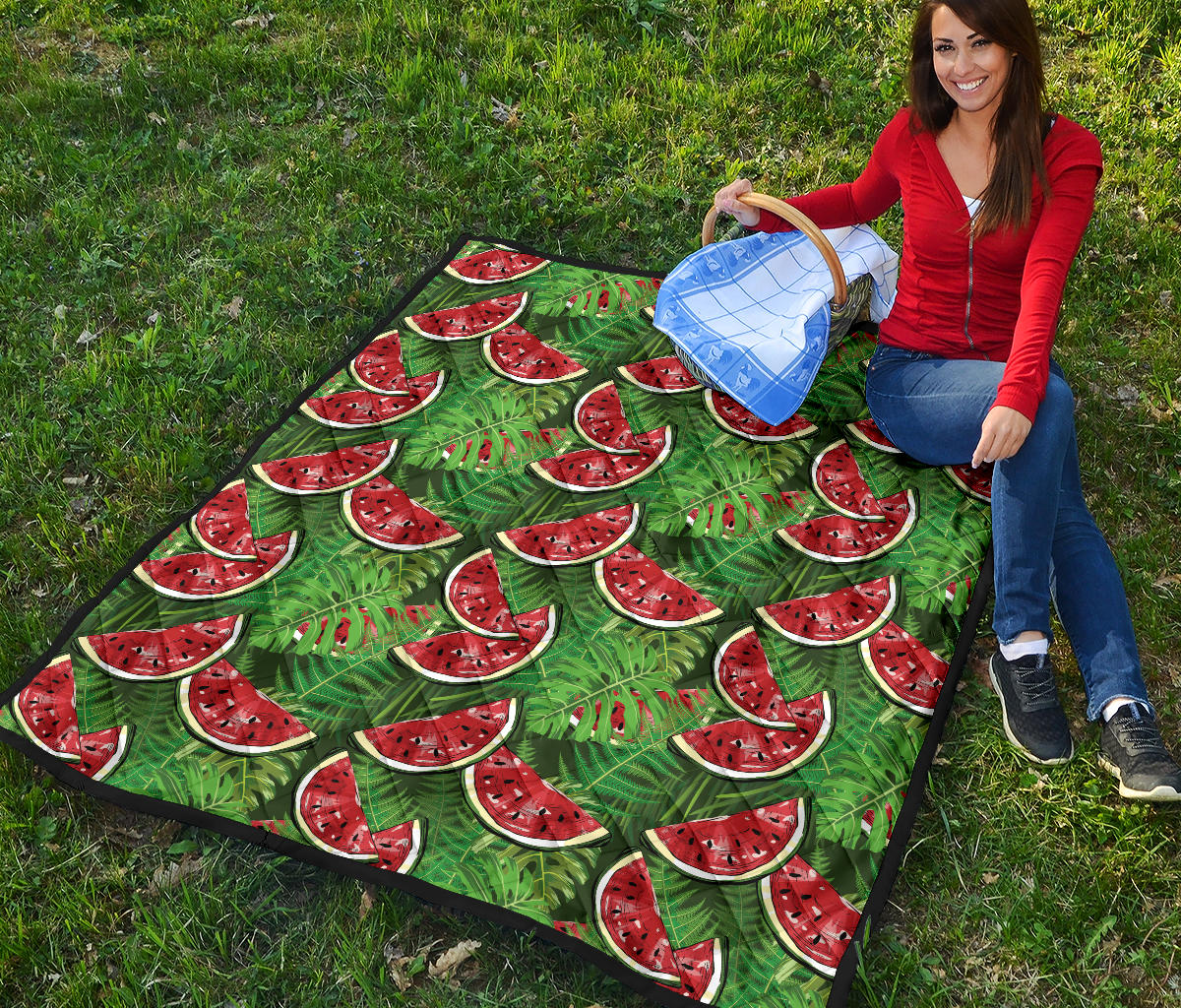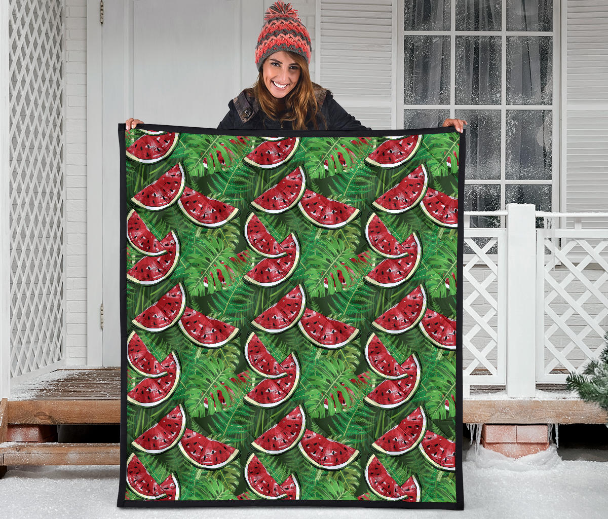 Watermelons Tropical Palm Leaves Pattern Background Premium Quilt is a uniqued design and limited item. It made to order, hand printed, and sewn with love in our factory.