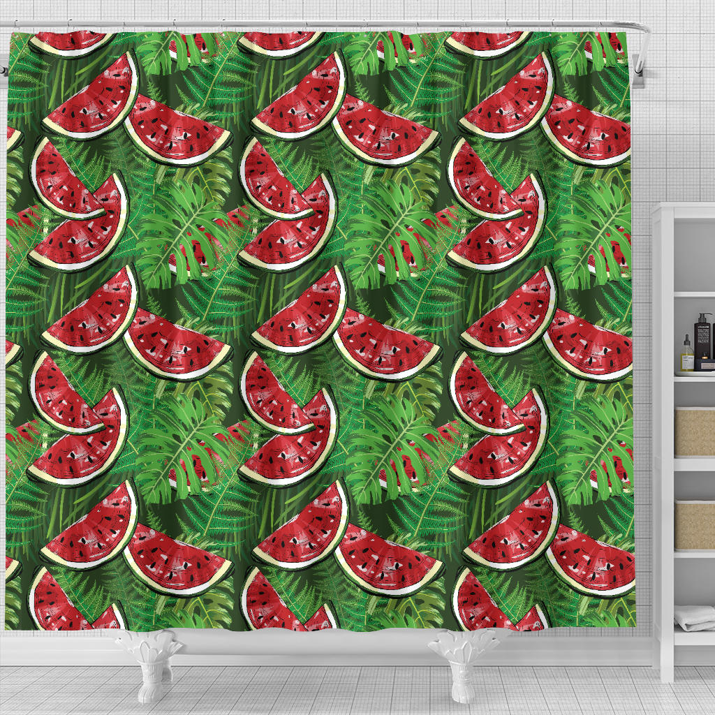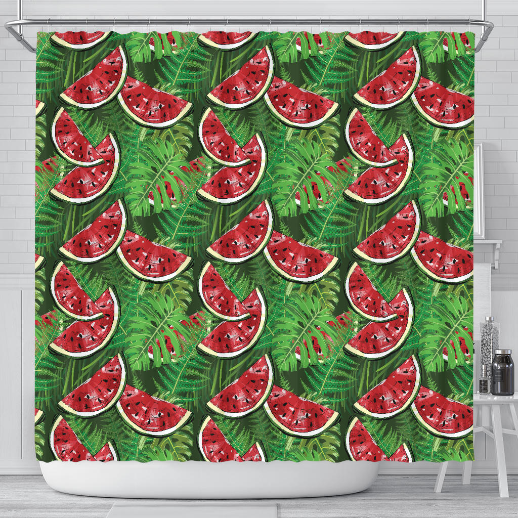 Watermelons Tropical Palm Leaves Pattern Background Shower Curtain Fulfilled In US