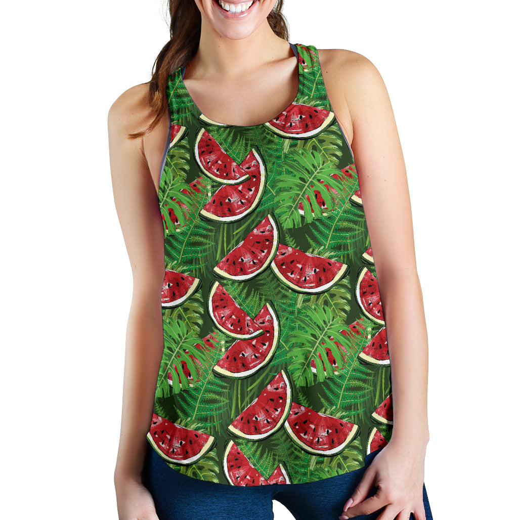 Watermelons tropical palm leaves pattern background Women Racerback Tank Top