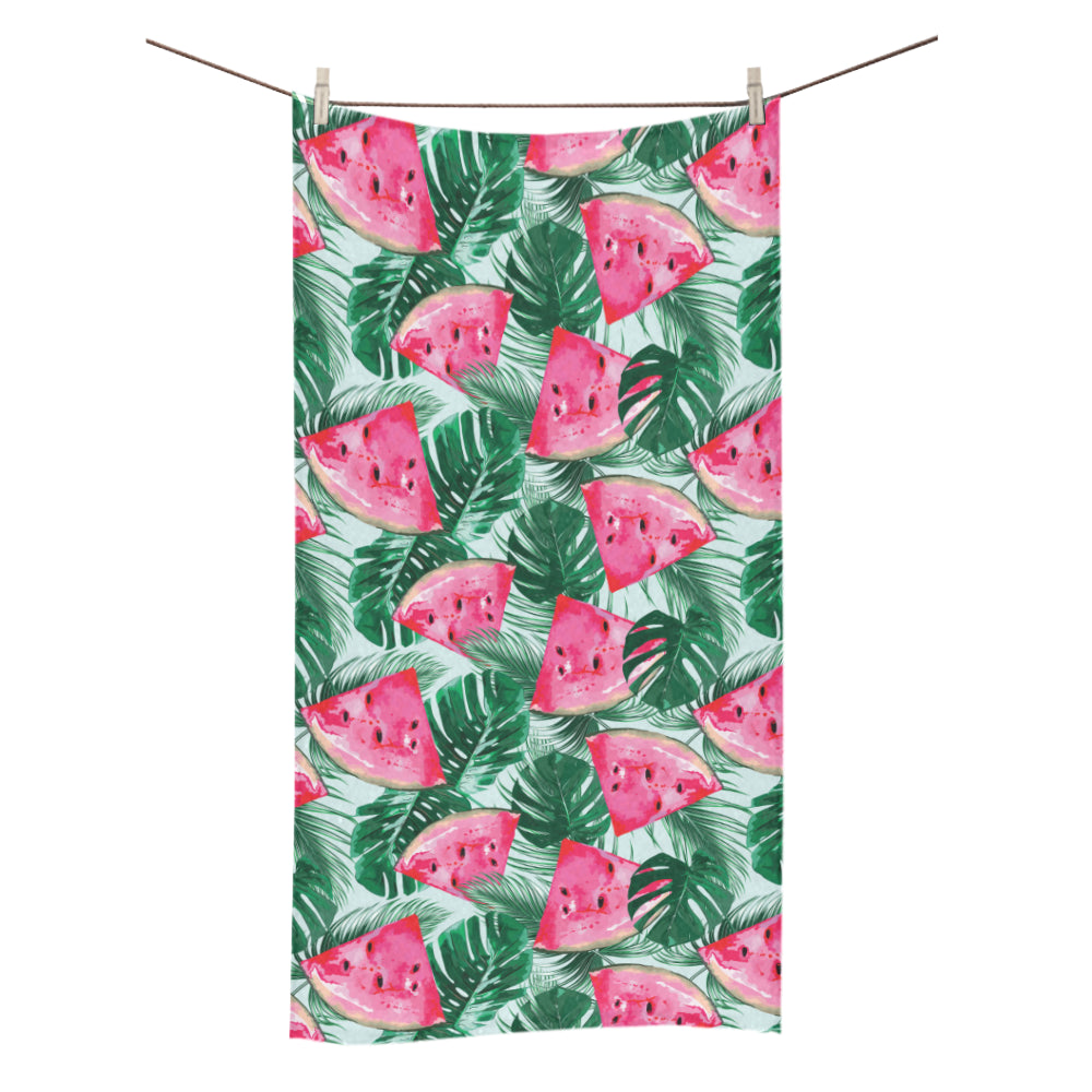 Watermelons tropical palm leaves pattern Bath Towel 30"x56" is a uniqued design and limited item. It made to order, hand printed, and sewn with love in our factory.