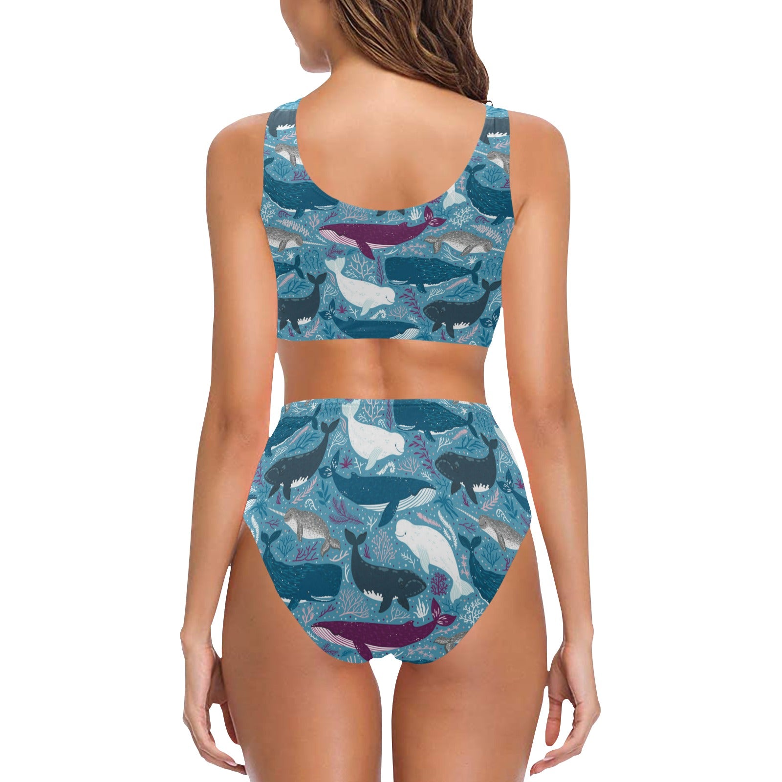 Whale design pattern Chest Bowknot High Waisted Bikini Swimsuit